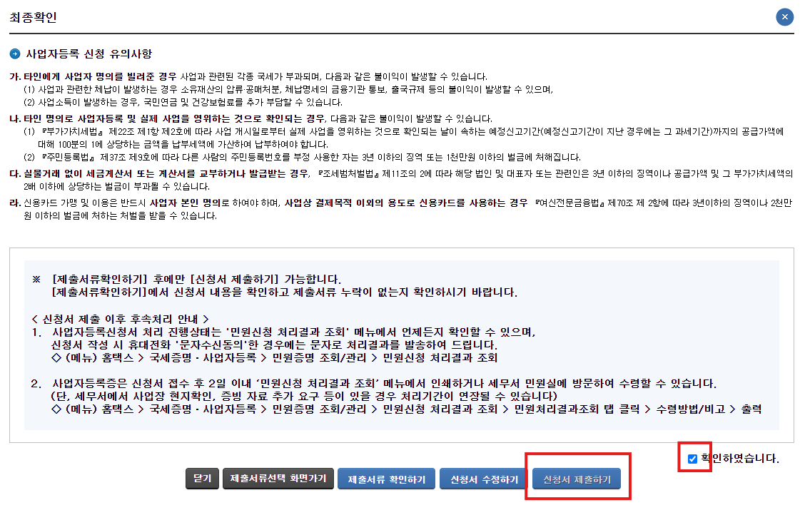 업종 설명란에는 '주거용 부동산 취득 및 매매' 정도 등으로 간략하게 기입하고, 아래 [사업자 유형 선택]에서 <면세>를 선택한 후 [저장 후 다음]을 누릅니다. 다음 화면에서 임대차 계약서 등의 제출서류를 첨부한 후 오른쪽과 같은 화면에서 '확인하였습니다.' 체크박스에 클릭 후 [신청서 제출하기]를 누르면 끝입니다.