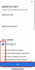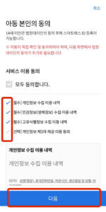 아동과 성인 절차는 크게 다르지 않으므로 이 글에서는 아동의 경우를 기준으로 말씀드리겠습니다. 맨 왼쪽과 같은 그림에서 아동이면 [스마트패스 ID 등록 14세 미만]을 누르고, 가운데 그림과 같은 다음 화면에서 [서비스 이용 동의] 체크박스에 체크 후, [다음]을 누릅니다. 맨 오른쪽과 같은 화면에서 법정대리인의 이용동의 후 [다음]을 선택합니다.