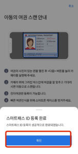 이제 스마트폰을 아이의 얼굴에 갖다대고 아이고 눈 뜬 상태로 2초, 눈 감은 상태로 2초, 다시 눈 뜬 상태로 2초 간 스캔합니다. 스캔이 다 되었다면 오른쪽 그림과 같이 스마트패스 ID 등록 완료 문구가 나타나고 [확인]을 누르면 끝입니다.
