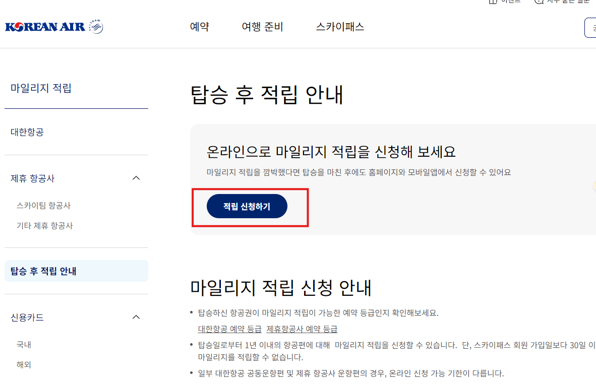 대한항공 홈페이지에서 우선 로그인 후, 상단 [스카이패스] - [탑승 후 적립 안내]를 누릅니다. 다음 화면에서 화면 중간의 [적립 신청하기]를 클릭합니다.