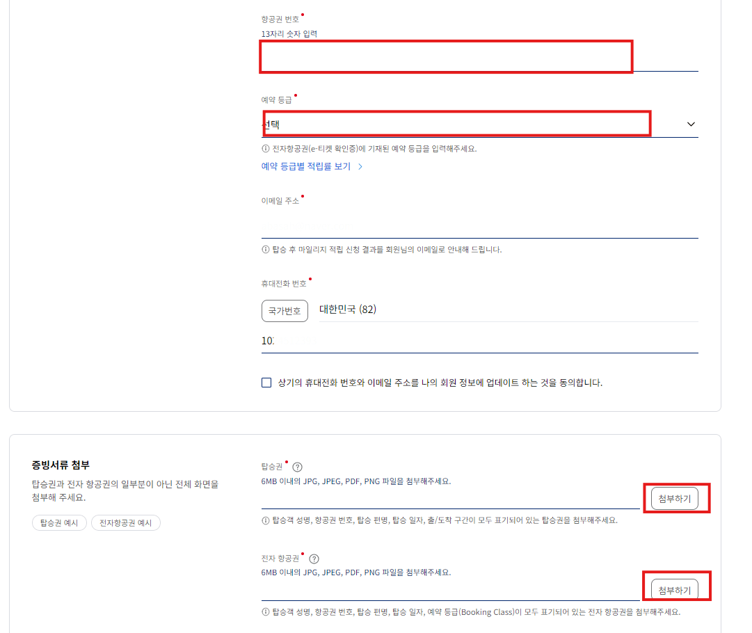 앞에서와 마찬가지로 탑승자 정보는 기본으로 입력되어 있으며, 앞에서 탑승 항공사 및 편명, 탑승일은 입력했으니 여기에서는 아래 출발지와 목적지, 그리고 [항공권 번호], [예약등급]만 입력하면 됩니다. 위에서 준비물이라고 말씀드린 E-ticket과 항공권 스캔파일을 첨부하고 [신청] 버튼을 누르면 완료됩니다.