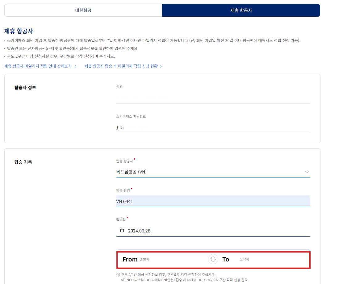 위의 세 항공사는 탑승일로부터 6개월이 지난 시점(1년 미만)에는 서비스센터에서 마일리지를 적립할 수 있습니다.
