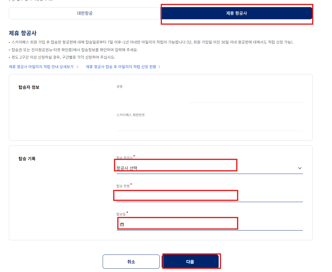 다음 화면에서 상단 탭을 [제휴 항공사]로 변경 후, 아래에서 [탑승 항공사], [탑승 편], [탑승일] 등을 지정 후, [다음]을 누릅니다.(로그인을 앞에서 했다면 성명과 스카이패스 회원번호는 기본으로 입력되어 있습니다.