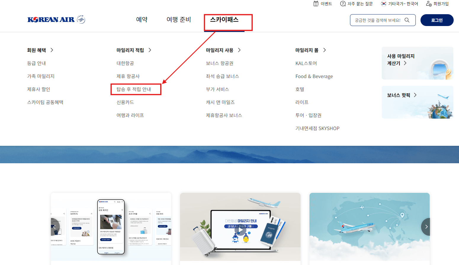 대한항공 홈페이지에서 우선 로그인 후, 상단 [스카이패스] - [탑승 후 적립 안내]를 누릅니다. 다음 화면에서 화면 중간의 [적립 신청하기]를 클릭합니다.
