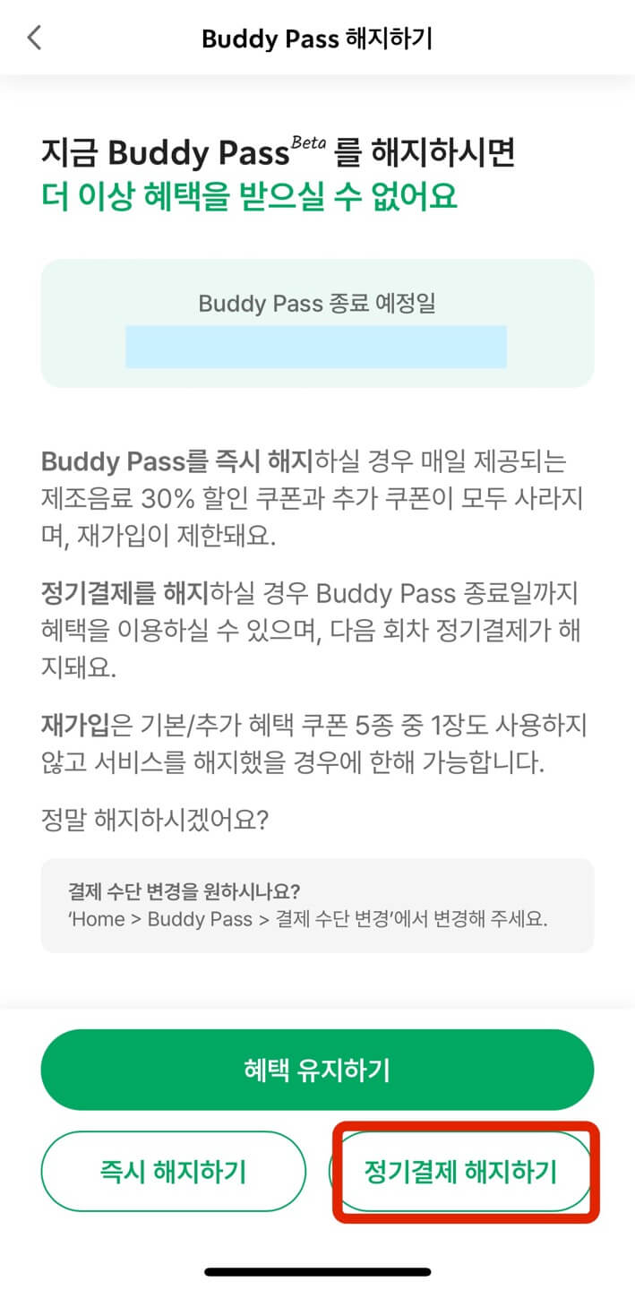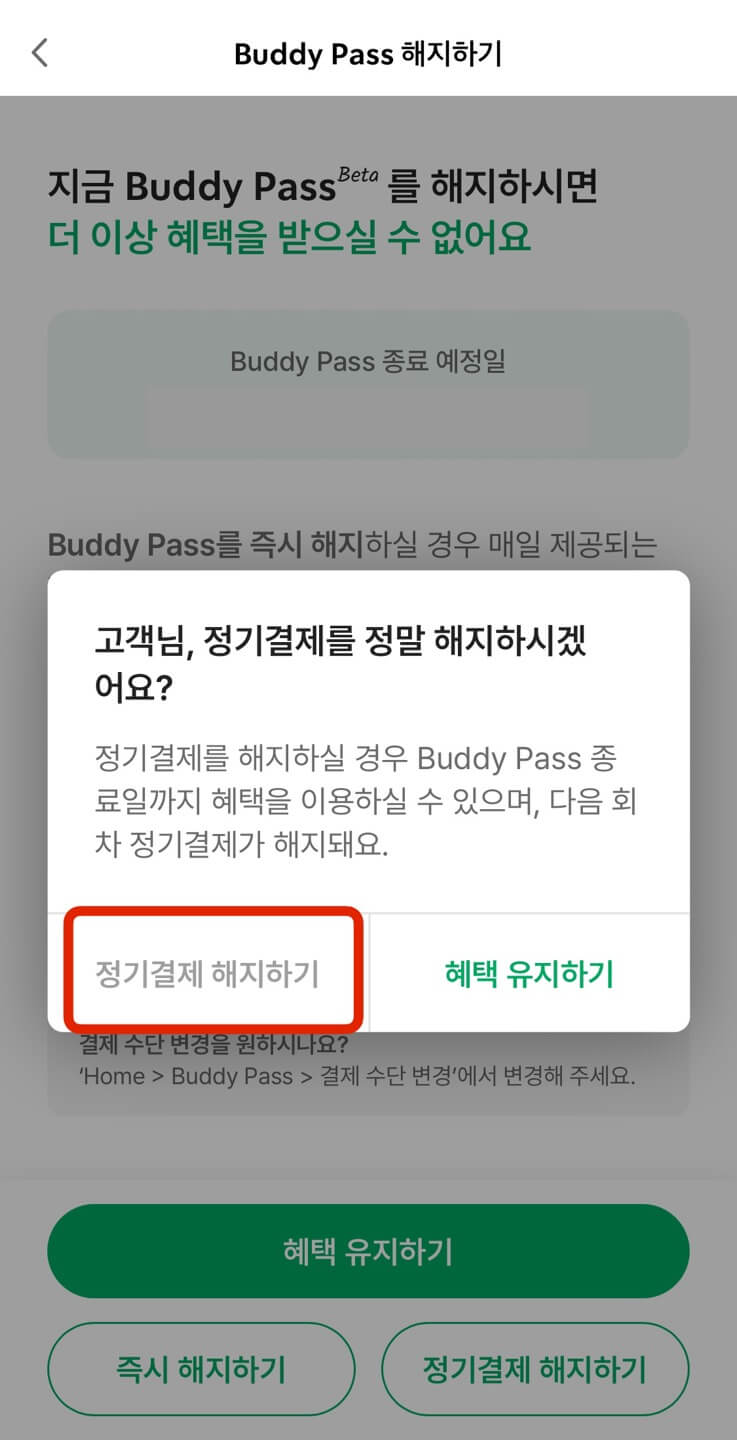 다음 화면에 나오는 해지사유 선택 후 [해지하기]를 누르면 오른쪽 그림처럼 즉시 해지와 정기결제 해지 두 가지 중 선택할 수 있습니다. 즉시 해지를 하면 현재까지 사용한 혜택 이용 차감 후 환불받게 되며, 정기결제 해지를 선택하면 현재 가입한 Buddy Pass는 종료일까지 이용 후, 다음 정기 결제가 이루어지지 않습니다.