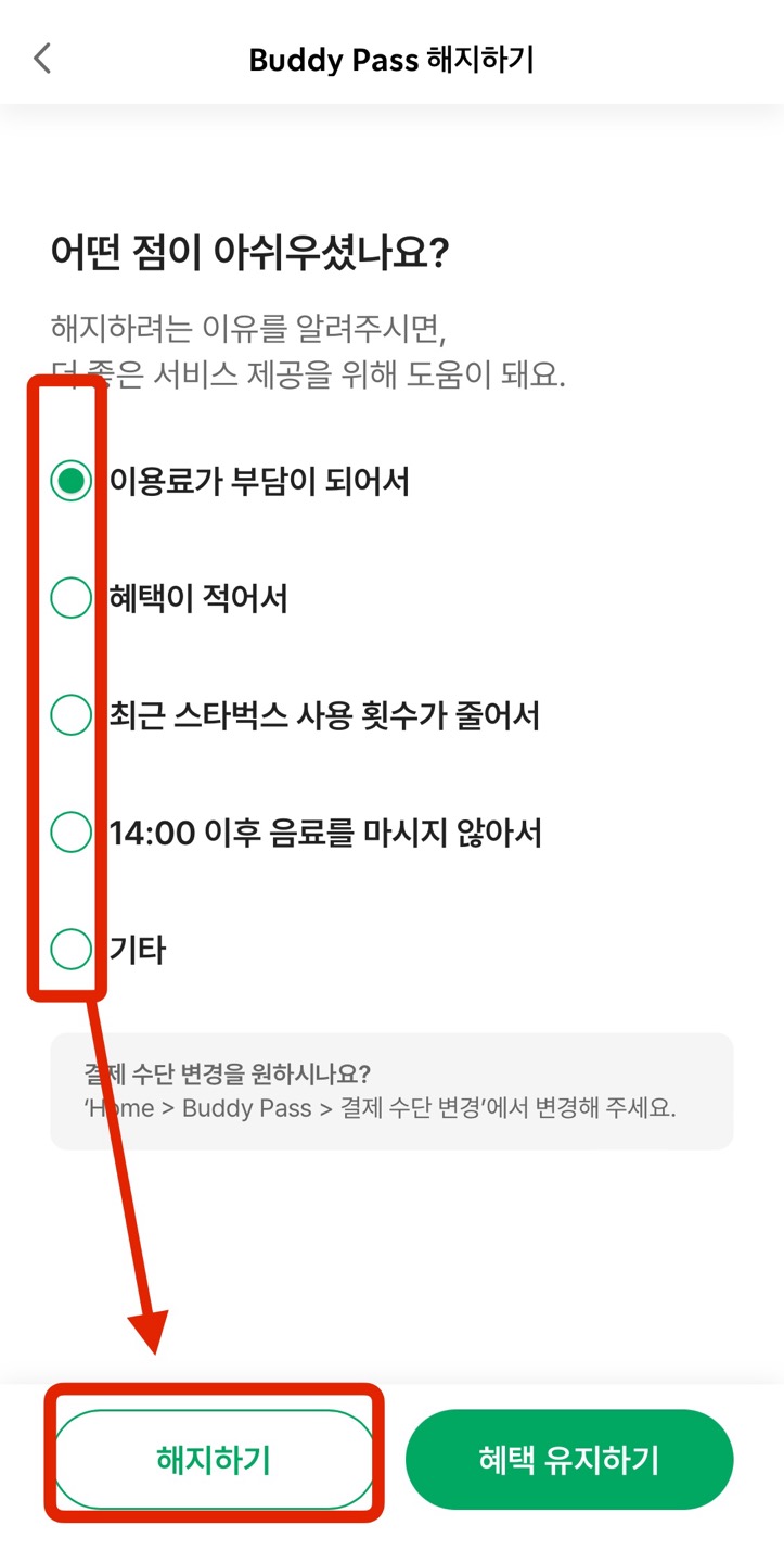 스타벅스 Buddy Pass를 해지하려면 스타벅스 상단 [Buddy Pass] 탭 - 다음 페이지 중간쯤 [Buddy Pass 해지하기] - 세 번째 화면에서 다시 [해지하기]를 누릅니다.