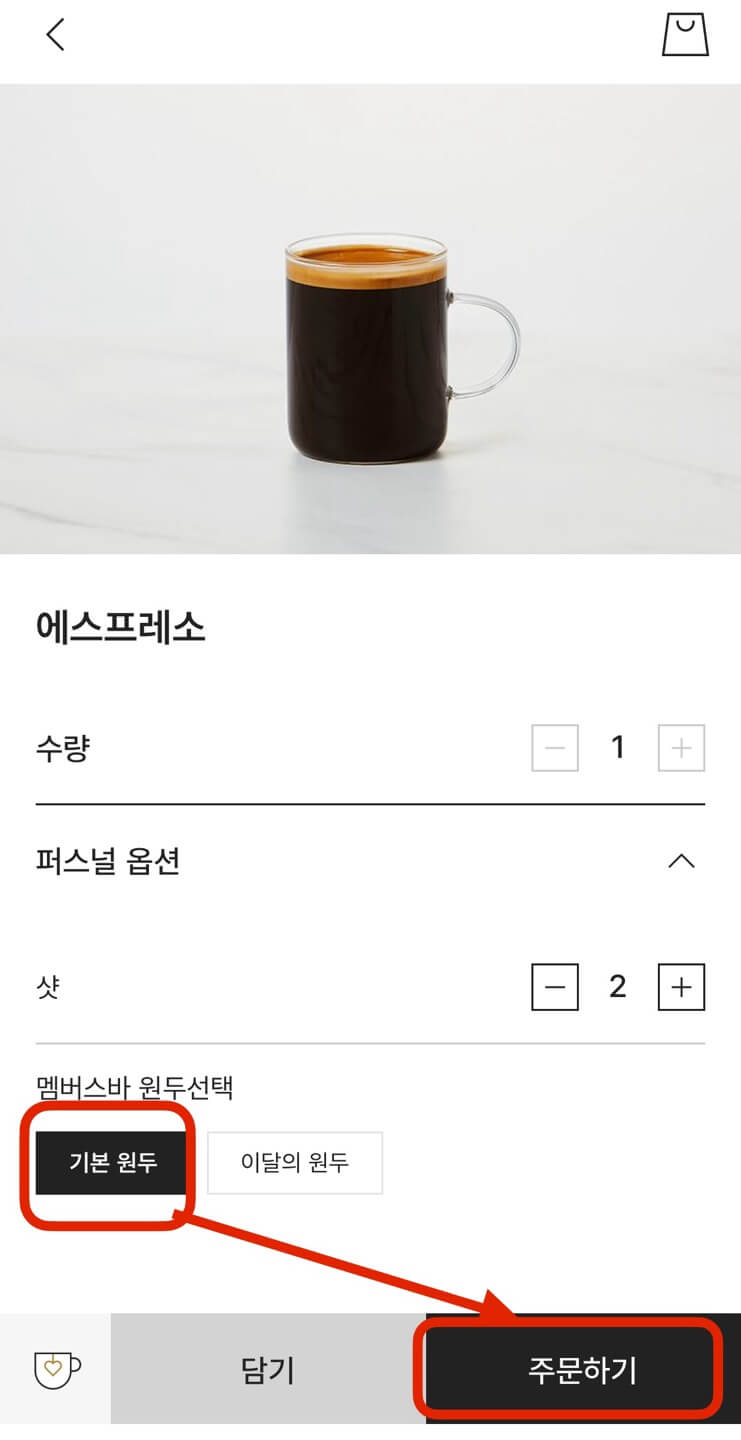 맨 왼쪽 그림과 같은 다음 화면에서 원하는 메뉴 선택 후, 커피의 경우 원두를 고른 후 우측 하단 [주문하기]를 클릭합니다.