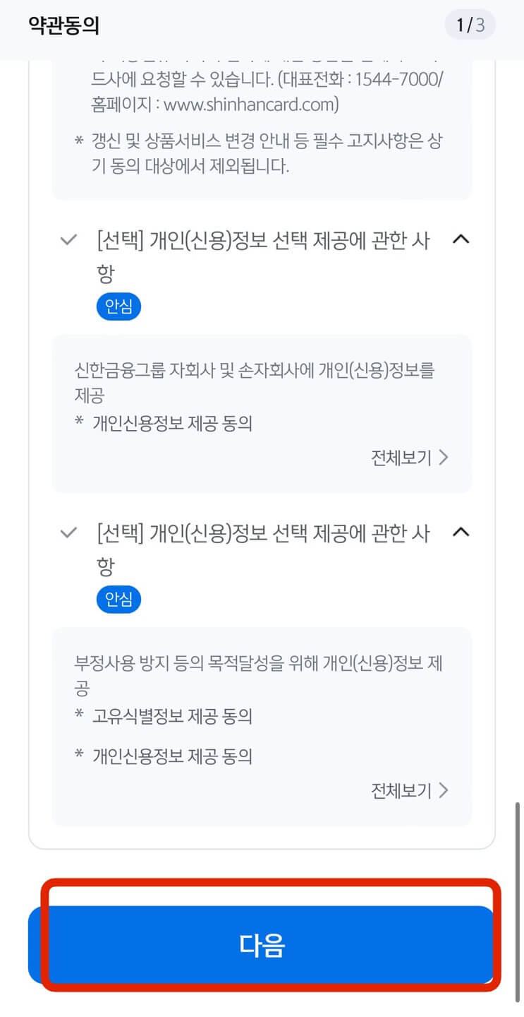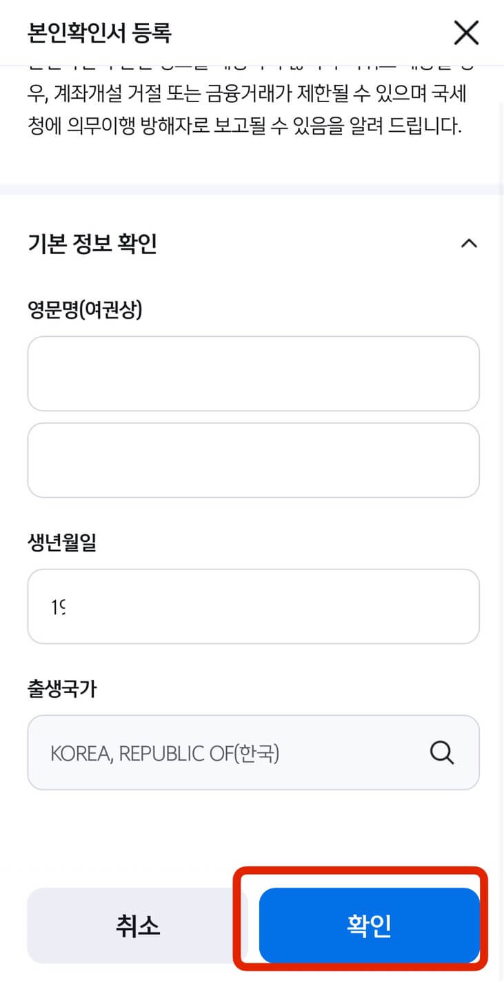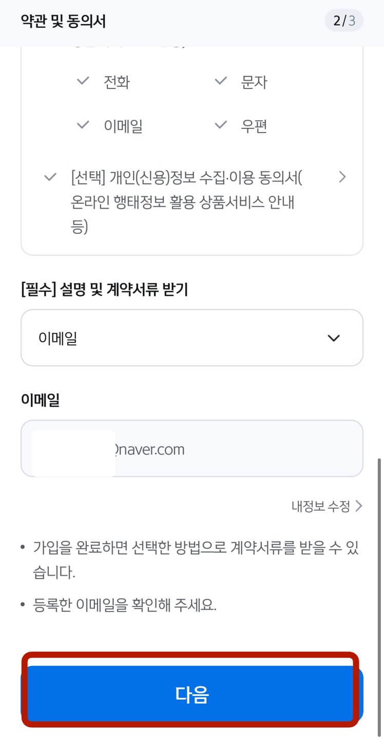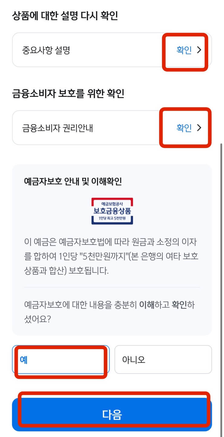 상품 설명에 대한 확인을 하였다는 [확인]을 모두 선택 후 [다음], 다음 화면에서 계약서류 받을 방법 선택 후 역시 [다음]을 누릅니다. 본인확인서에 영어 이름과 성, 생년월일을 적고 [확인]을 누르면 끝입니다.