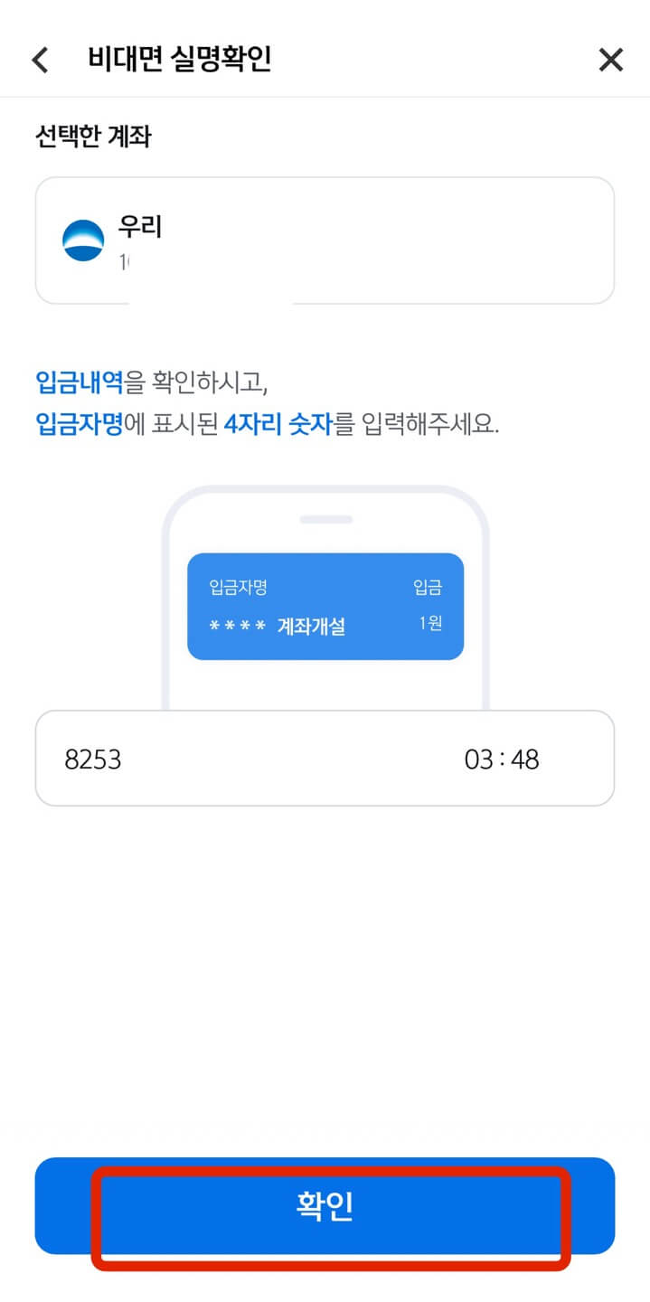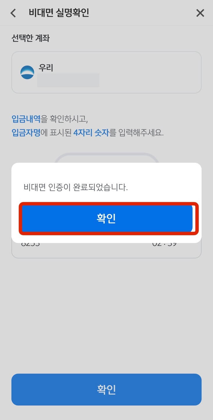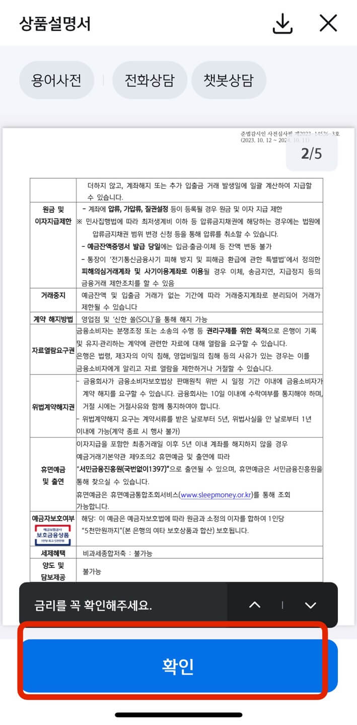 계좌에 1원 입금한 입금자명 숫자 네 자리를 입력 후 [확인]을 누르면 가운데 그림처럼 비대면 인증이 완료되었다는 메시지가 표시됩니다. 그 다음부터는 상품설명서인데 읽어보시고 [확인]을 누릅니다.
