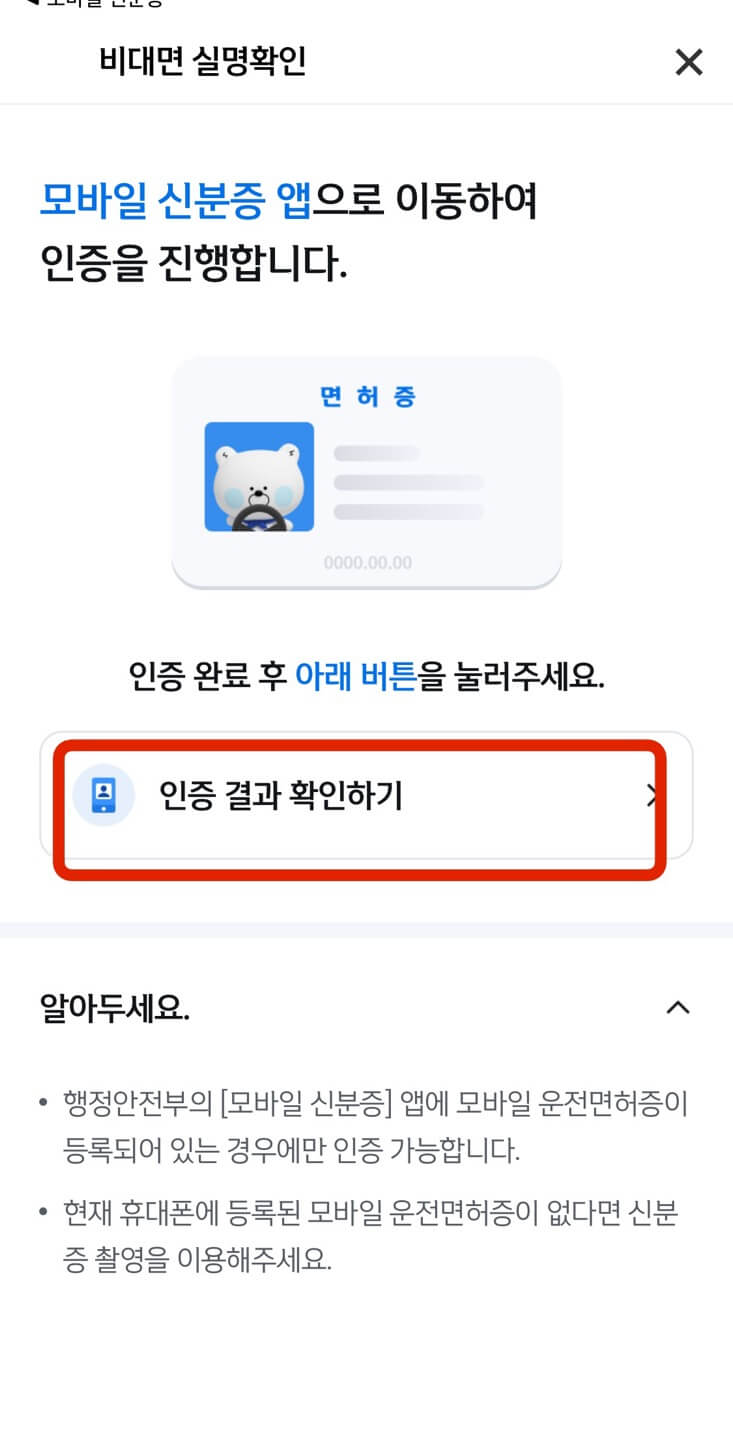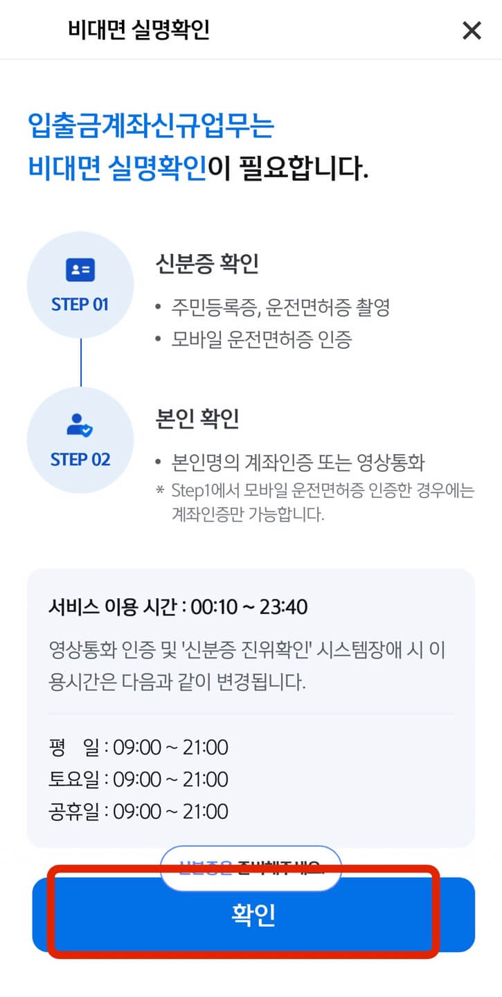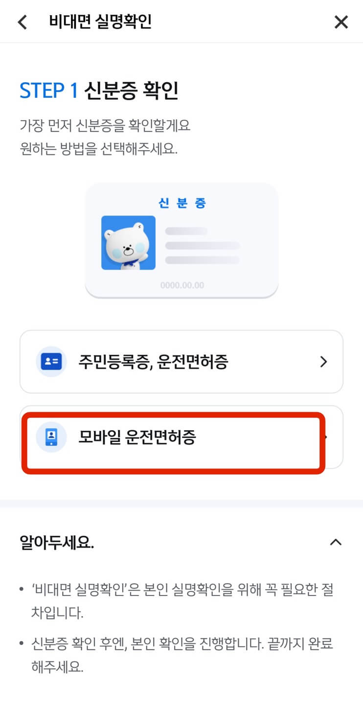 원하는 신분증을 선택하여 신분 확인 후, 본인 계좌로 1원을 입금하는 방식으로 계좌인증을 진행합니다.