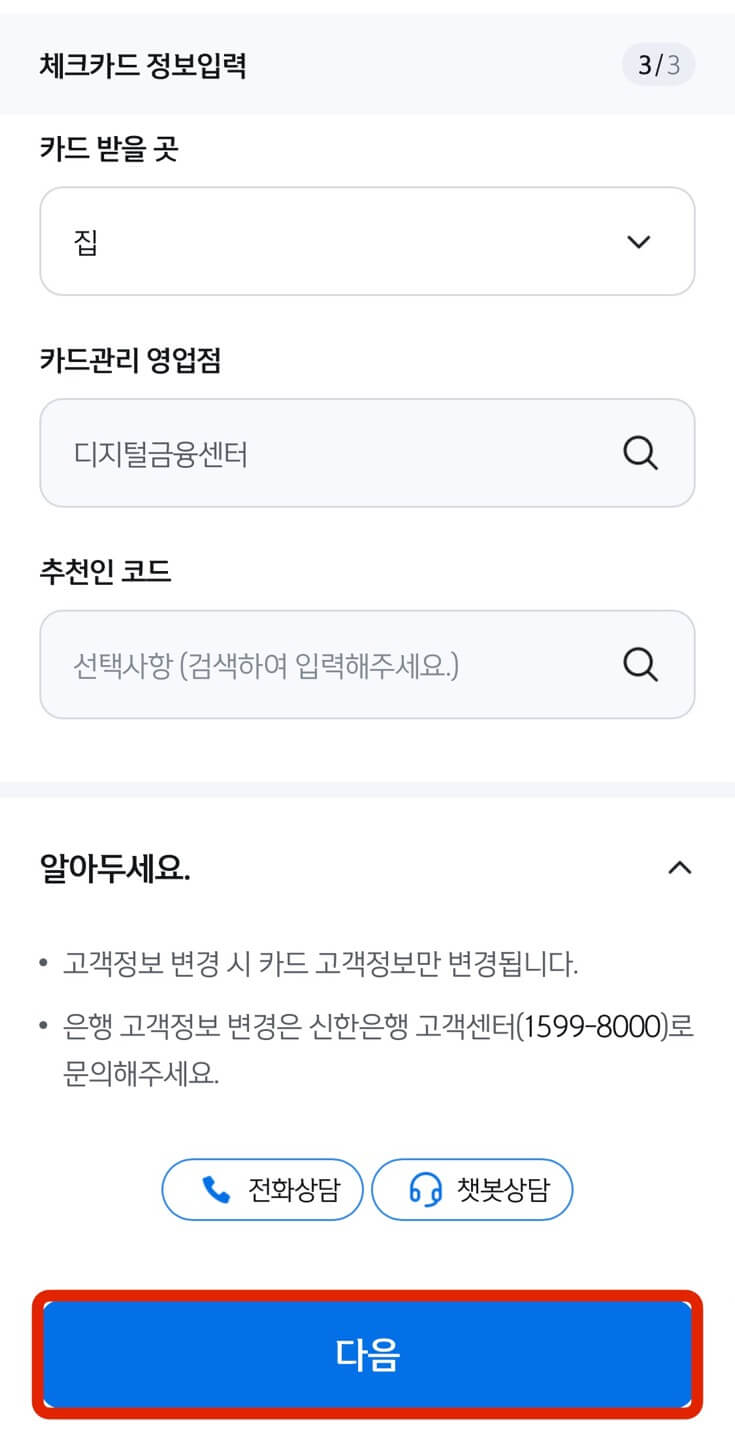 약관동의는 쭉 읽어보고 아래 [다음]을 누른 후 위에서 개설한 계좌 두 개에 대한 비밀번호를 입력 후 [다음]을 선택합니다. 카드 받을 곳 및 카드관리 영업점을 선택하고 [다음]을 누릅니다. 기본이 '디지털금융센터'라고 지정이 되어있고 변경도 가능하지만 어차피 셀프로 신청하는 것이니 크게 변경할 이유는 없을 것 같습니다.