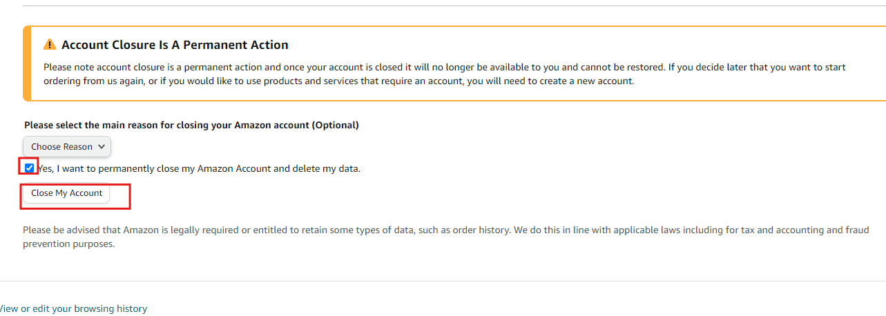 그럼 드디어 얘네들이 꼭꼭 숨겨놓은 [close my account]가 보입니다. 선택합니다. 그럼 위의 그림에서는 잘렸지만 아마존을 탈퇴하면 너는 어떤 혜택을 놓치게 될 거라는 협박조의 말이 보이는데, 쭉 스크롤을 내려 맨 아래까지 옵니다. 오른쪽과 같이 계정을 탈퇴한다는 체크박스에 체크 후, [close my account]를 다시 한 번 누릅니다.