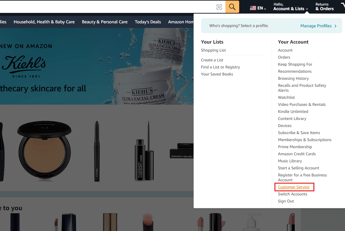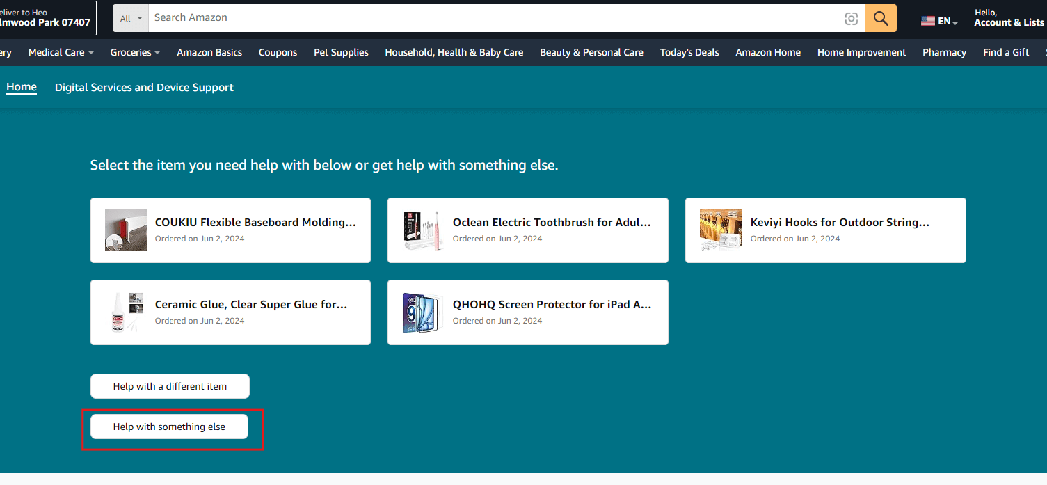 아마존 홈페이지에서 로그인 후, 왼쪽 그림처럼 메인화면 우측 상단의 [accounts & List] - [costomer service]를 선택합니다. 다음 페이지에서 큰 네모들 아래 [help with something else]를 선택합니다.