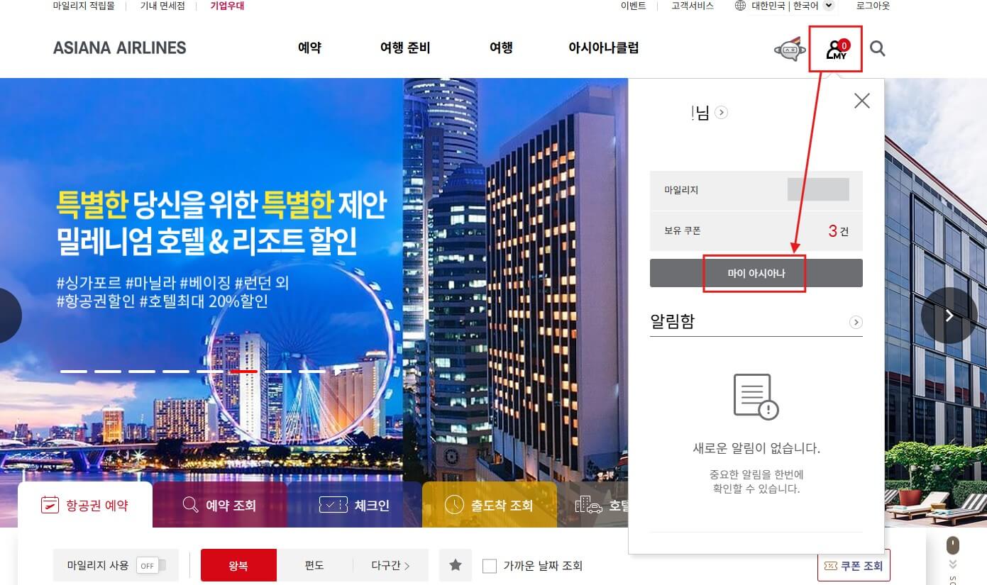 준비물이 모두 준비되었다면 이제 본격적으로 가족 마일리지 합산을 신청할 차례입니다. 먼저, 아시아나항공 홈페이지에 접속합니다.(이 글은 아시아나항공 홈페이지를 기준으로 말씀드리니 참고하시기 바랍니다.)