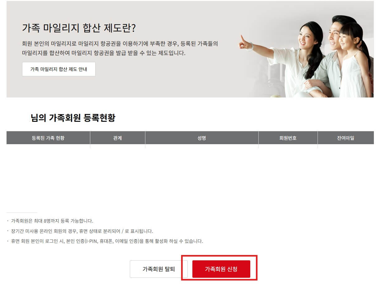 - 아시아나 클럽 가입 필수(가족 마일리지 합산 신청인 모두 가입)