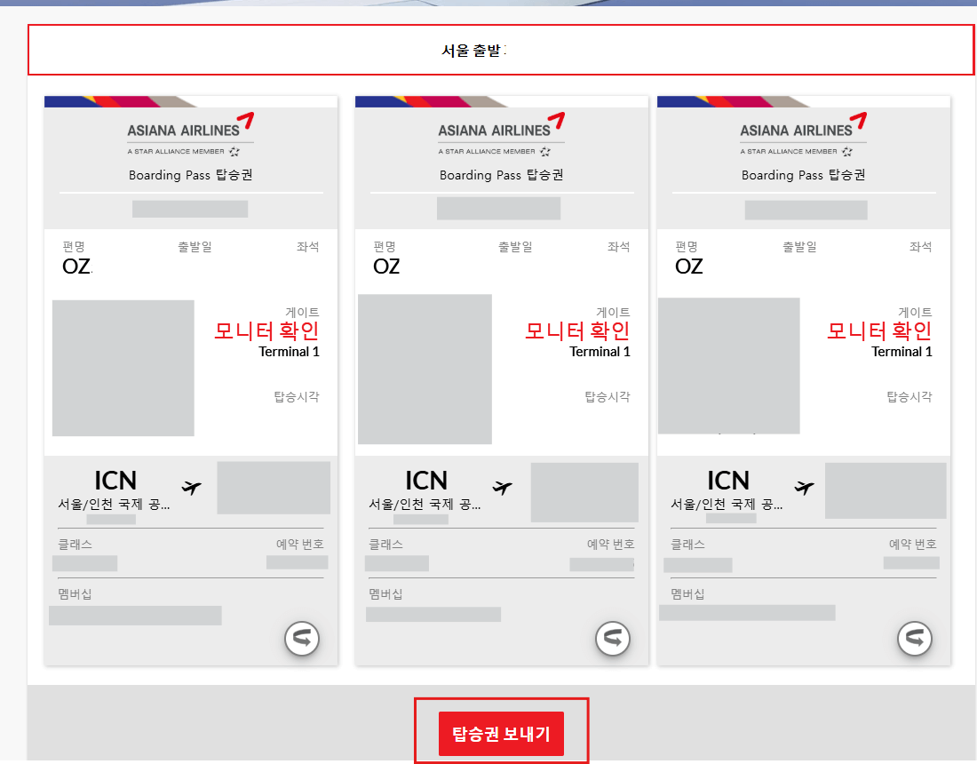 왼쪽과 같이 탑승권이 표시되면 [탑승권 보내기]를 선택 후, 오른쪽 그림처럼 이메일이나 SMS 중 원하는 채널 선택 후 [탑승권 보내기]를 눌러 출력을 하거나 휴대폰에 저장한 후 사용하면 됩니다.