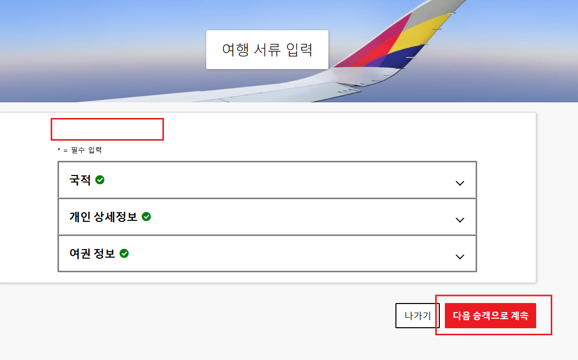 승객 한 명마다 국적, 개인 상세정보 및 여권 정보를 입력 후, 우측 하단 [다음 승객으로 계속]을 눌러 일행 모두를 기입하였다면 오른쪽 그림처럼 우측 하단 [체크인]을 다시 클릭합니다.