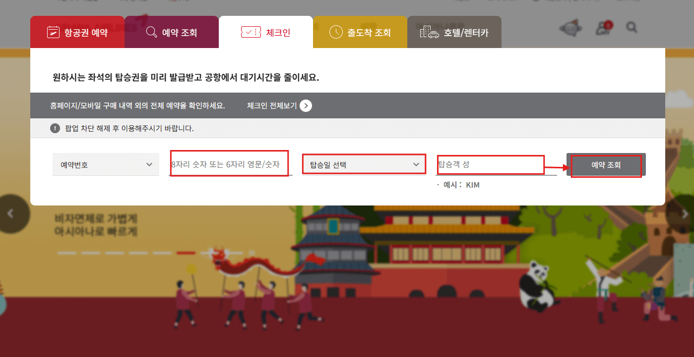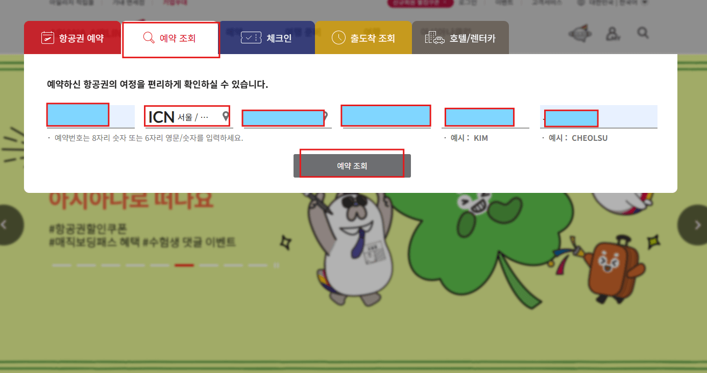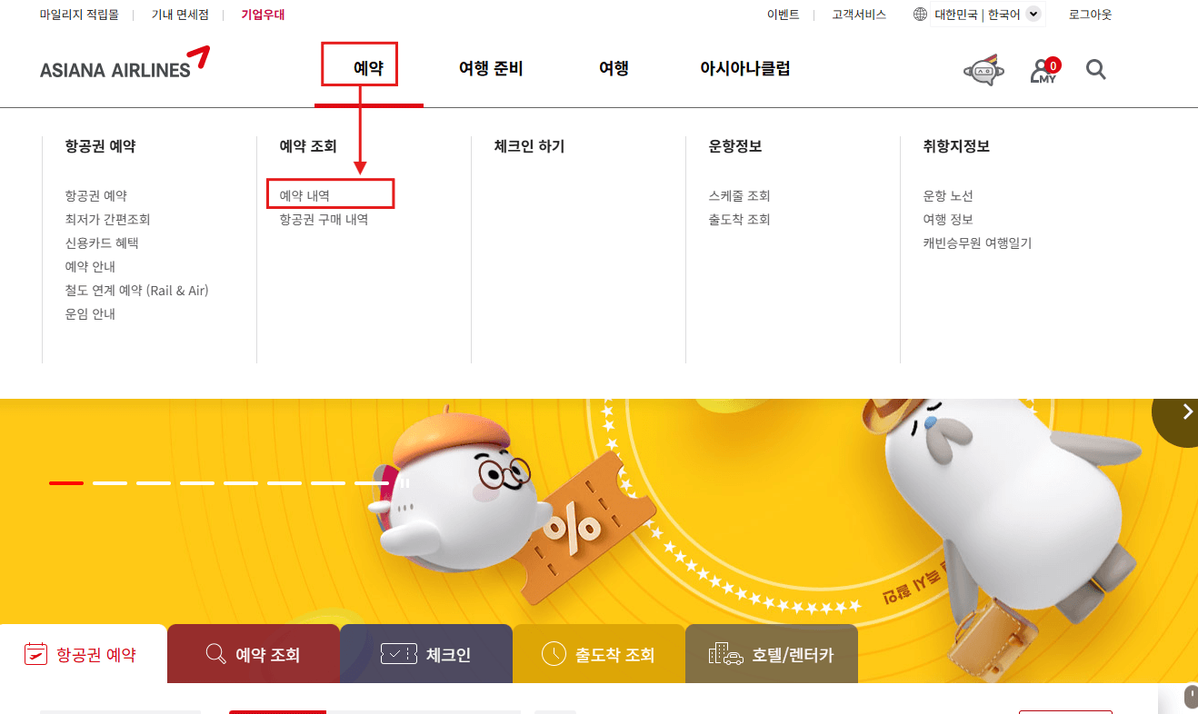 아시아나항공 홈페이지에 접속했다면 먼저 [예약조회]를 해야합니다.