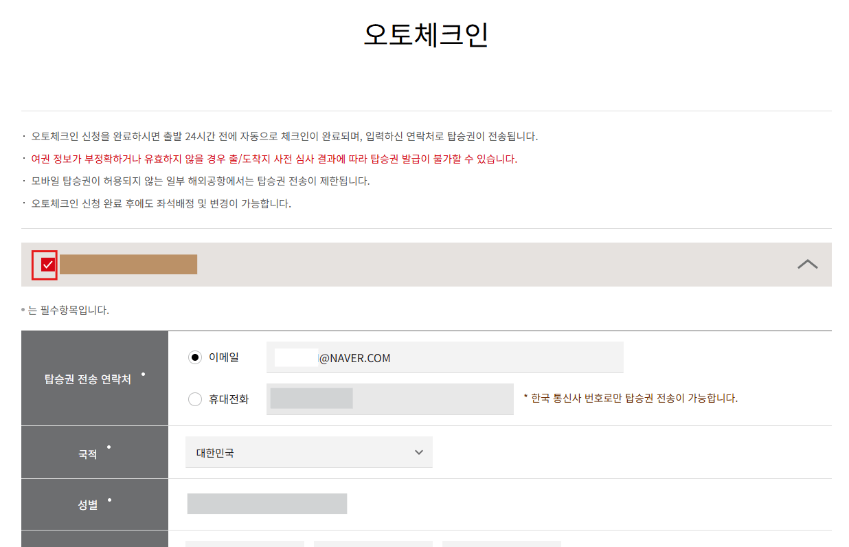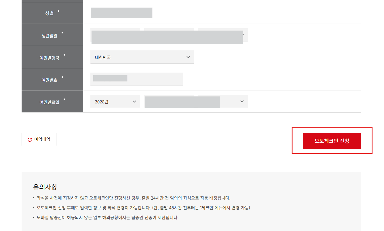 이어서 생년월일, 여권발행국, 여권번호 및 여권만료일을 모두 입력 후 [오토체크인 신청]을 누르면 완료됩니다.