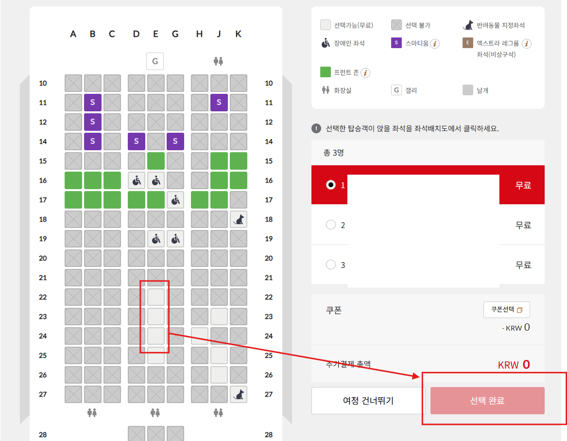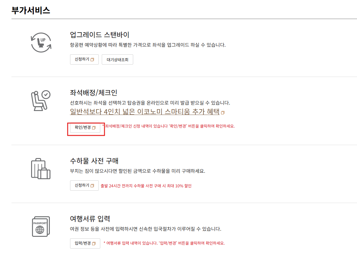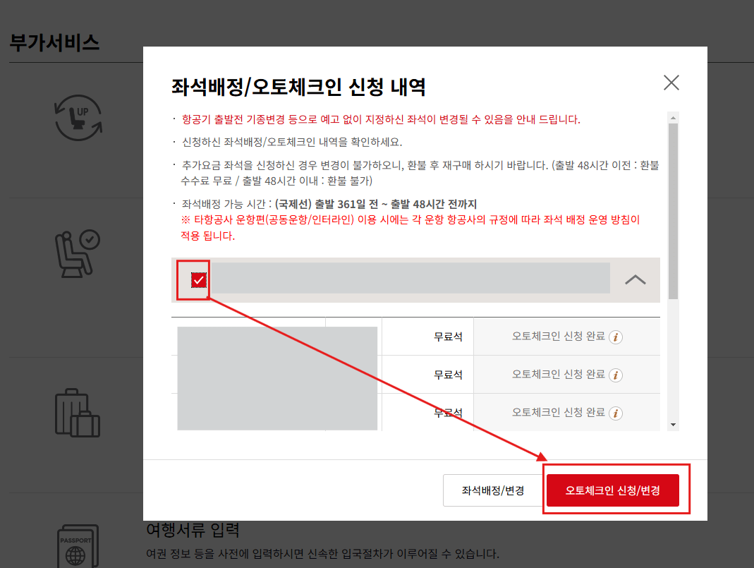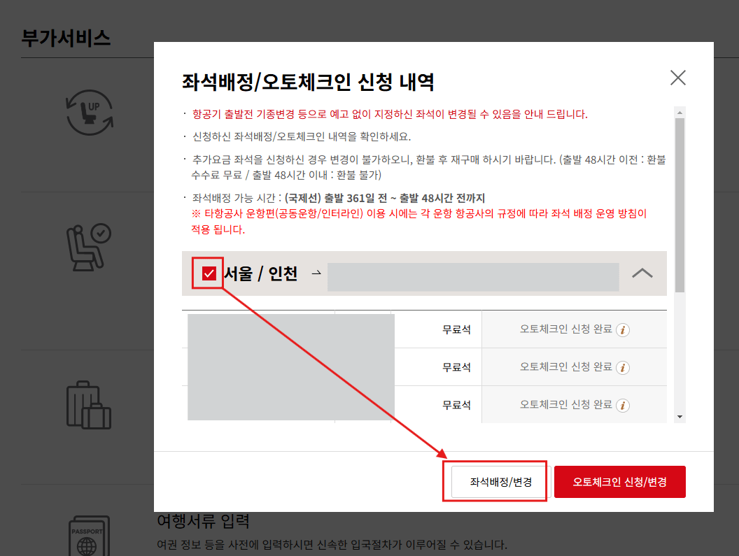 1. 좌석지정 가능기간 : 국제선의 경우 출발 361일 전 ~ 출발 48시간 전까지
