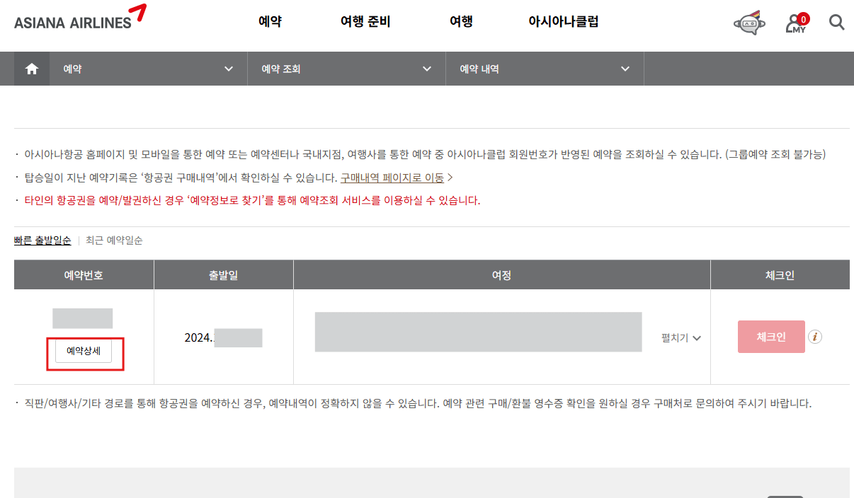 왼쪽 그림처럼 예약한 내역이 뜨면 예약번호 아래 [예약상세]를 클릭하고, 아래 [부가서비스] 중 [좌석배정]을 차례로 누릅니다.
