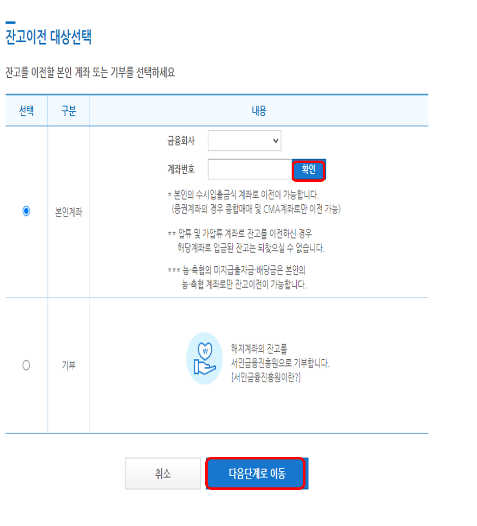그럼 해당 계좌에 대한 잔고 및 개설일 등 자세한 내역이 표시되는데요, 여기에서 [계좌해지 잔고이전] 아래 [신청]버튼을 선택합니다. 오른쪽과 같인 본인계좌로 송금을 하거나 서민금융진흥원에 기부 중 하나를 선택할 수 있습니다. 원하는 것을 선택 후 [다음단계로 이동]을 클릭합니다.