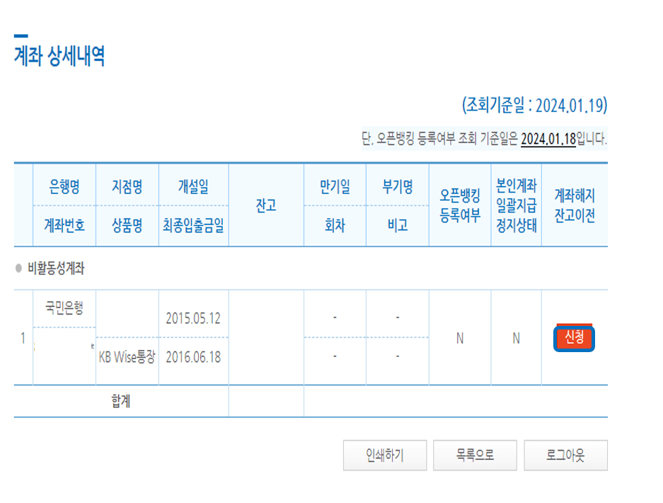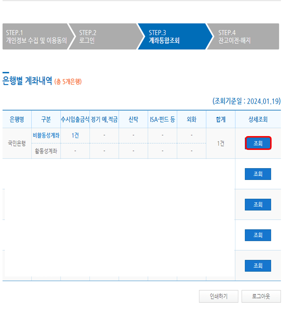 주민번호를 입력한 후, 원한느 방법으로 로그인을 하면, 오른쪽과 같은 [은행별 계좌내역]이 표시됩니다. 현재 사용하지 않는 계좌 옆의 [조회]를 누릅니다.