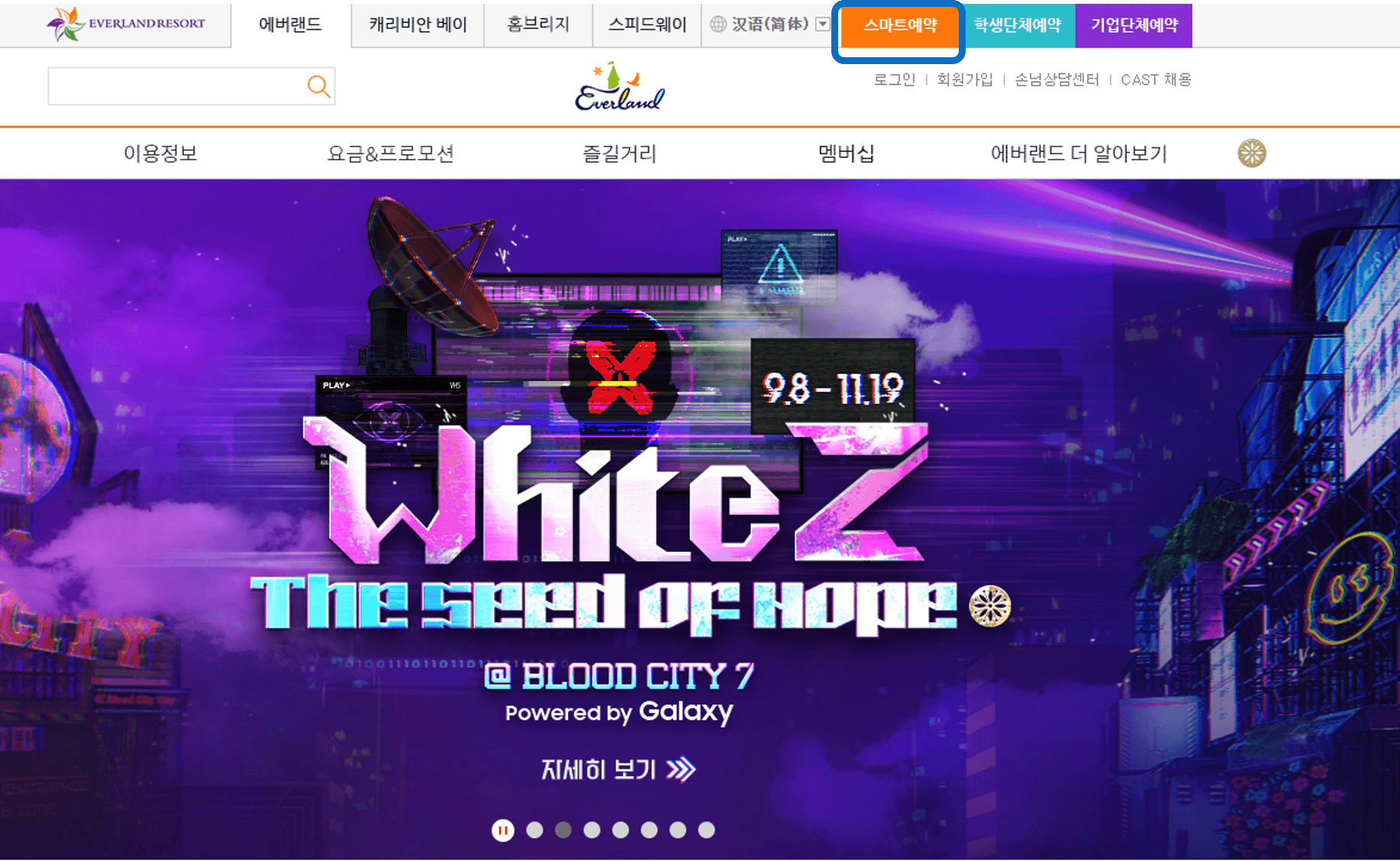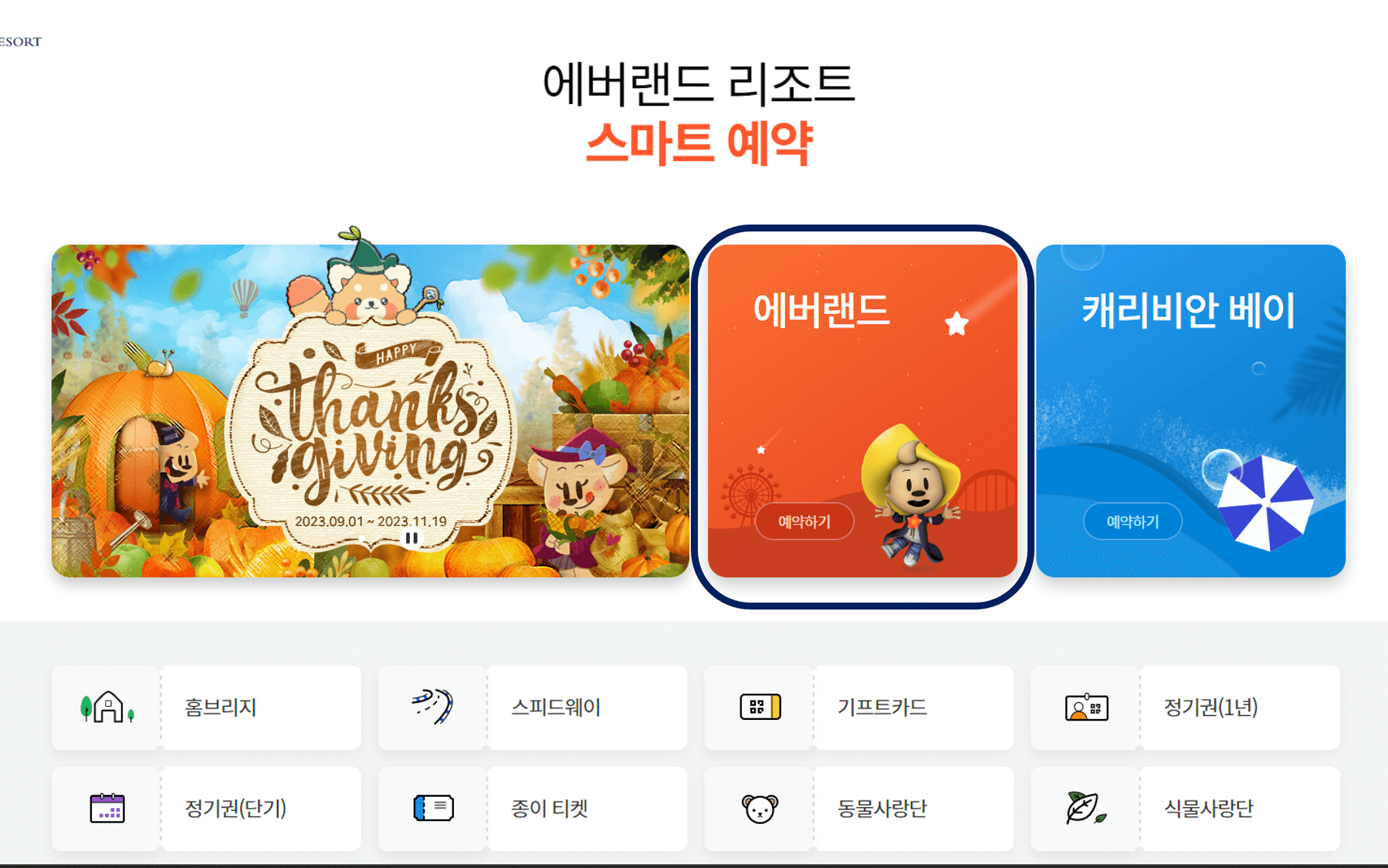 먼저 에버랜드 홈페이지를 검색해서 들어가면 왼쪽과 같은 화면이 나타나는데, 우측 상단 주황색의 [스마트 예약] 버튼을 누릅니다. 그러면 '스마트예약' 홈페이지로 넘어가는데 화면에서 가운데 [에버랜드]를 클릭합니다.