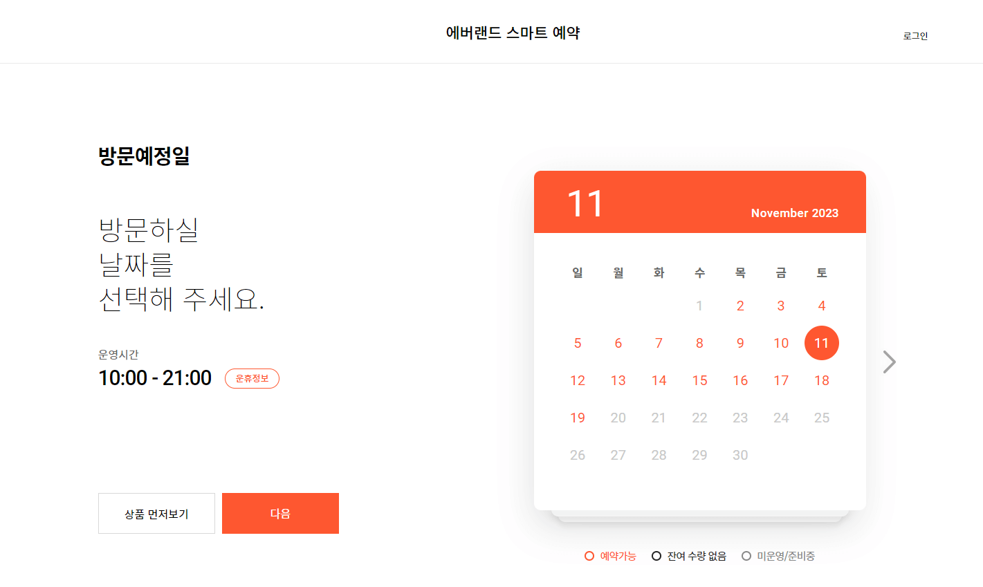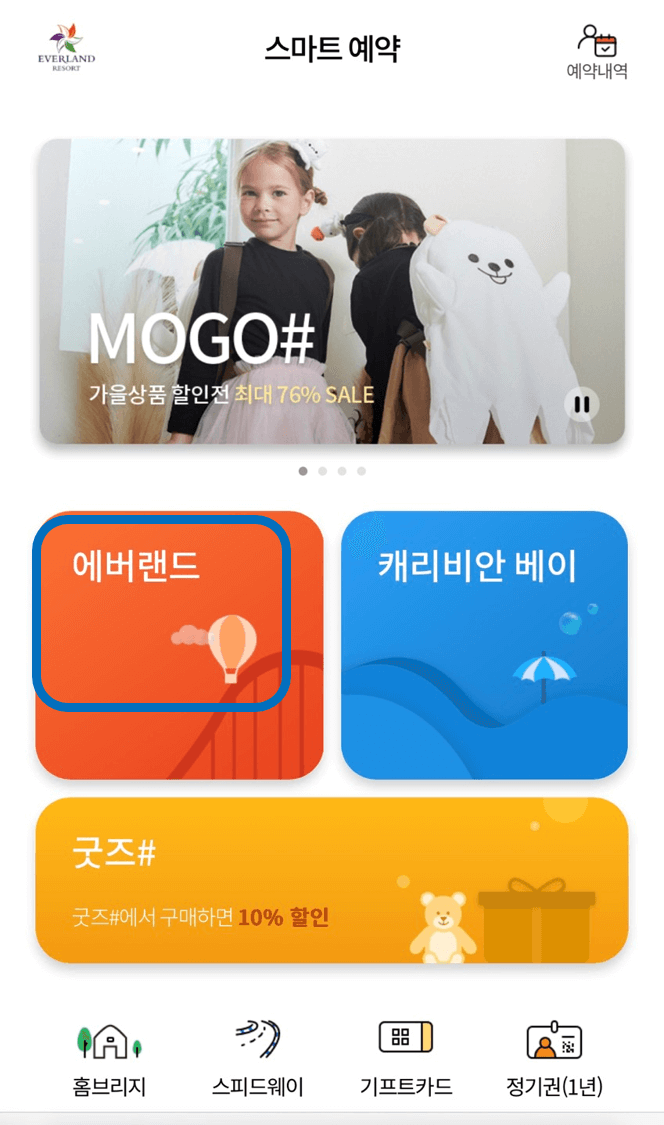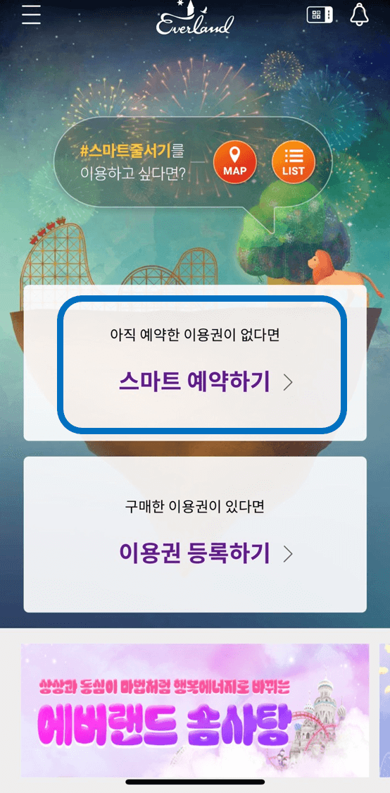 에버랜드 어플을 설치하면 왼쪽과 같은 화면이 현시되는데요, 여기에서 [스마트 예약하기] - 다음 화면에서 [에버랜드]를 선택합니다.