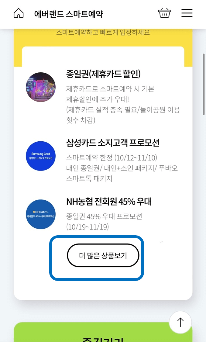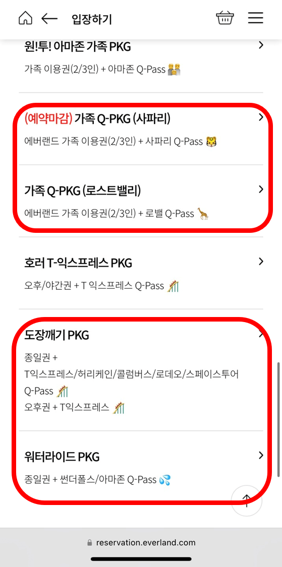 아래로 조금만 내리다 보면 [더 많은 상품보기]가 있는데, 이 단추를 누르면 날짜 선택하는 화면이 보입니다. 원하시는 날짜를 선택하면 홈페이지에서처럼 많은 이용권이 표출되는데, 쭉~~ 아래로 내리면 [스페셜 패키지], 그중에서도 아래쪽에 위에 말씀드린 '가족 Q-PKG', '도장깨기 PKG'와 '워터라이드 PKG'가 자리 잡고 있습니다.