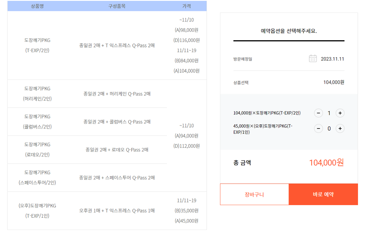 종일권 2매 + T 익스프레스 Q-Pass 2매 | ~11/10 (A)98,000원 (D)116,000원 11/11~19 (B)84,000원 (A)104,000원 |