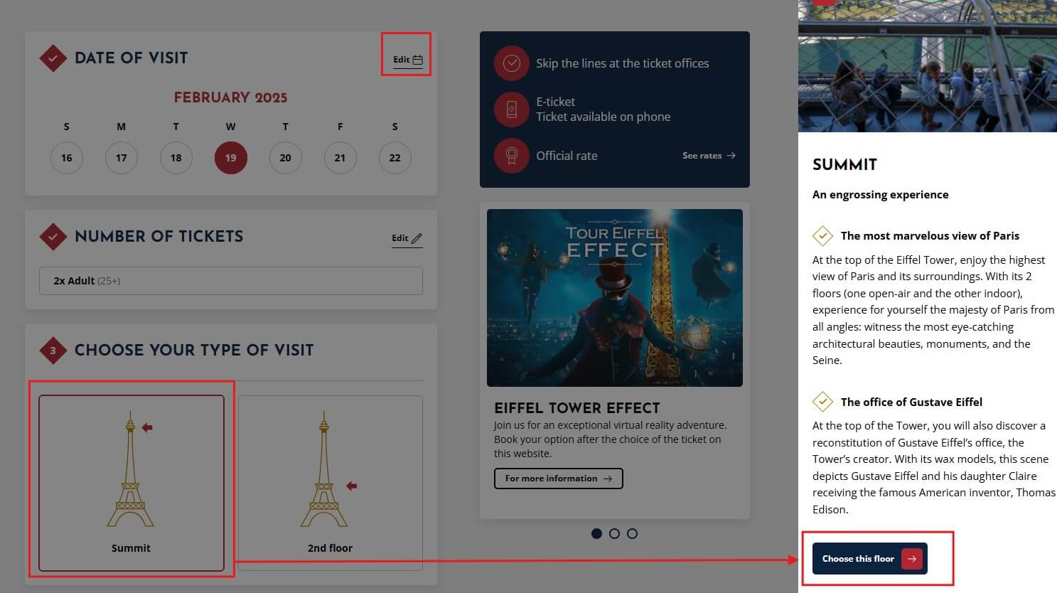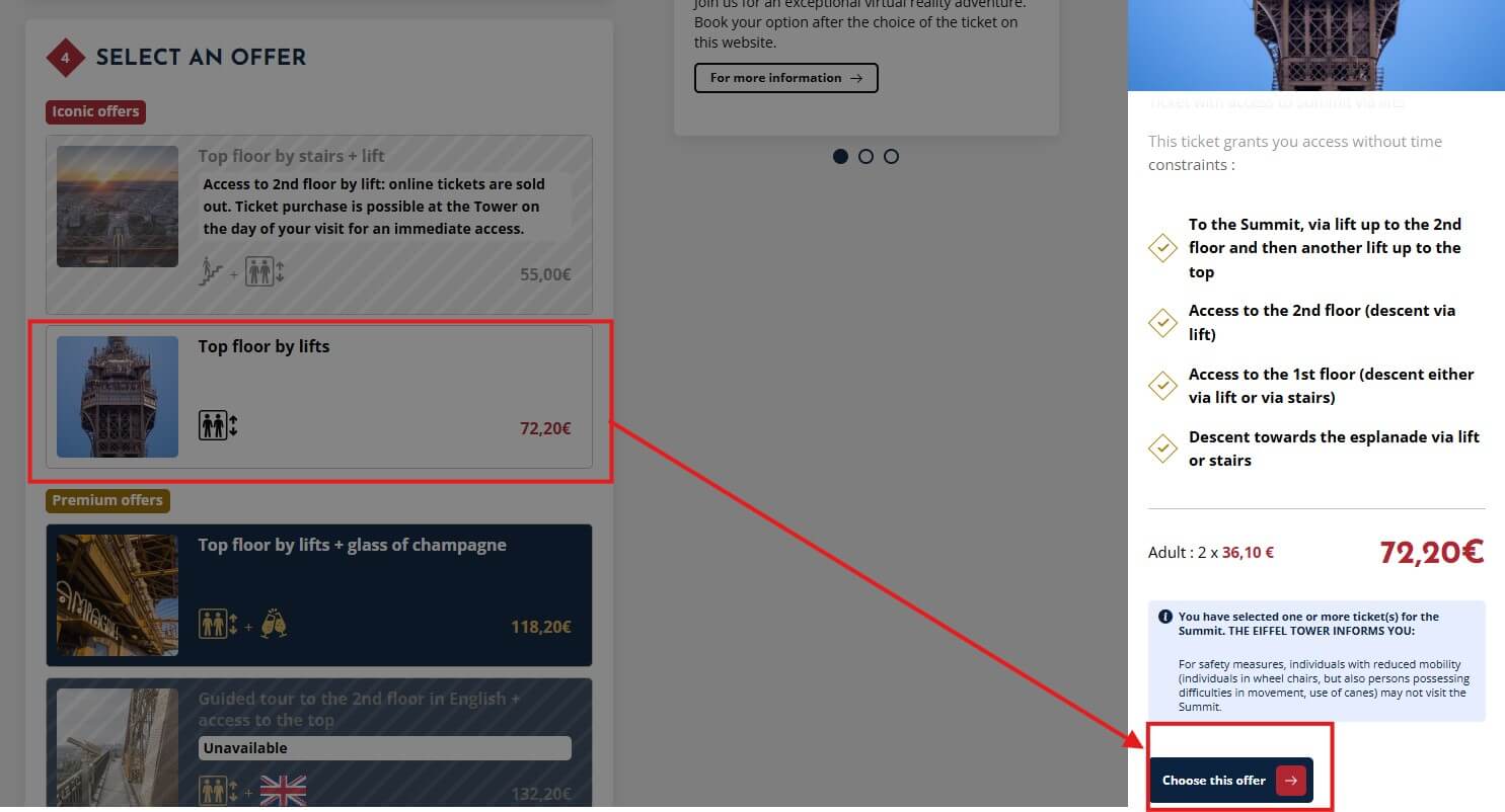 참고로 공홈에서 에펠탑 입장권 구입은 입장일로부터 2달 전부터 오픈됩니다. 언뜻 보면 금방 마감되는 것 같이 보이지만 수시로 들어가면 취소되는 표가 자주 발생하므로 원하는 날짜와 시간에 자리가 없더라도 낙담하지 말고 수시로 확인해 보시기 바랍니다. 또한 2월 7일까지 정상까지 입장은 제한하고 있으므로 그전에 방문하실 분들은 참고하시기 바랍니다.