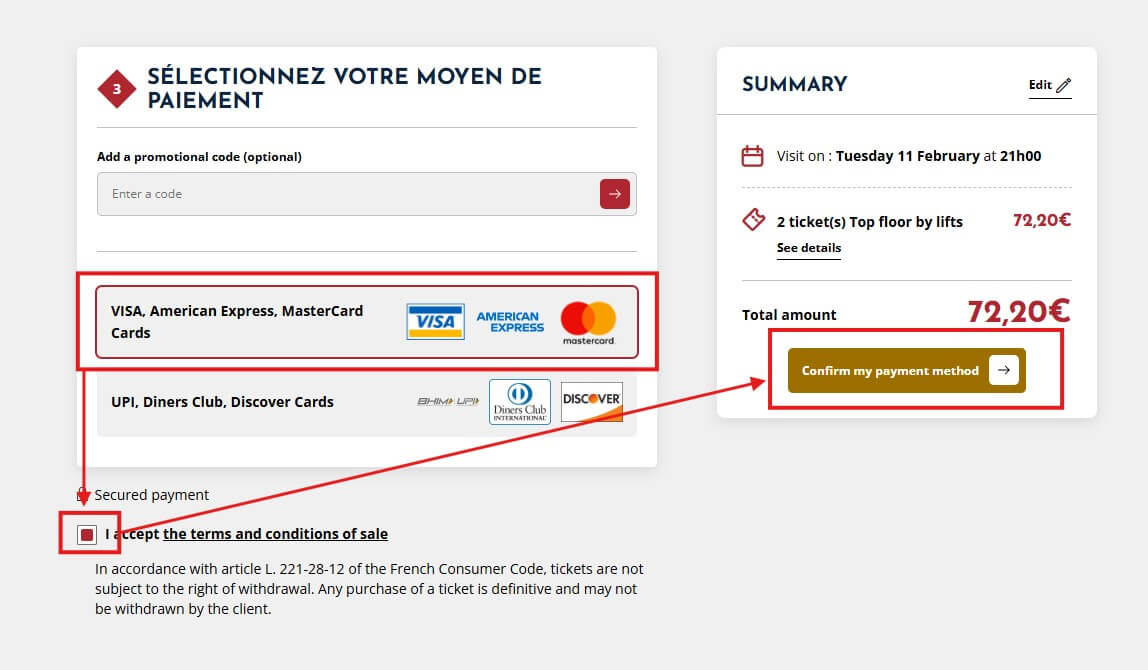 이제 다시 한번 방문 날짜와 시간, 티켓 가격을 확인 후 [Continue]를 누르고 원하는 결제방식 선택구매조건 동의 체크박스에 체크 후, 우측의 [Confirm my payment method]를 눌러 결제를 진행하면 구매가 완료됩니다.