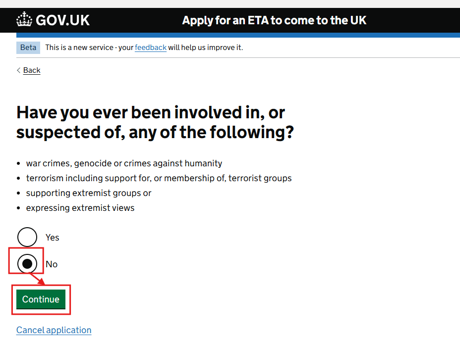 그다음엔 범죄를 저질렀거나 테러 등에 가담한 적이 있냐는 질문에는 모두 'No'를 선택 후 [Continue]를 누릅니다.