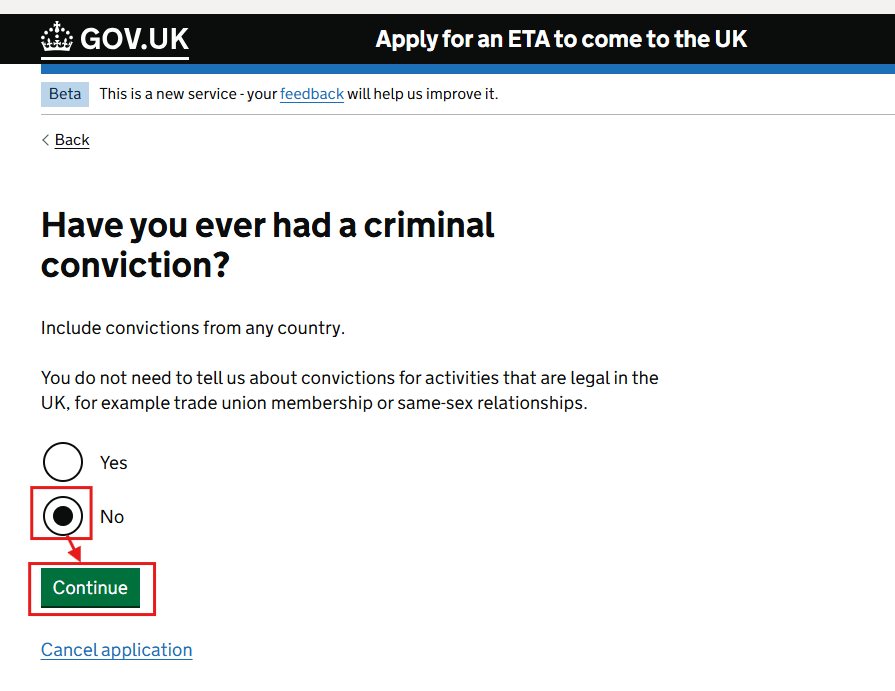 그다음엔 범죄를 저질렀거나 테러 등에 가담한 적이 있냐는 질문에는 모두 'No'를 선택 후 [Continue]를 누릅니다.