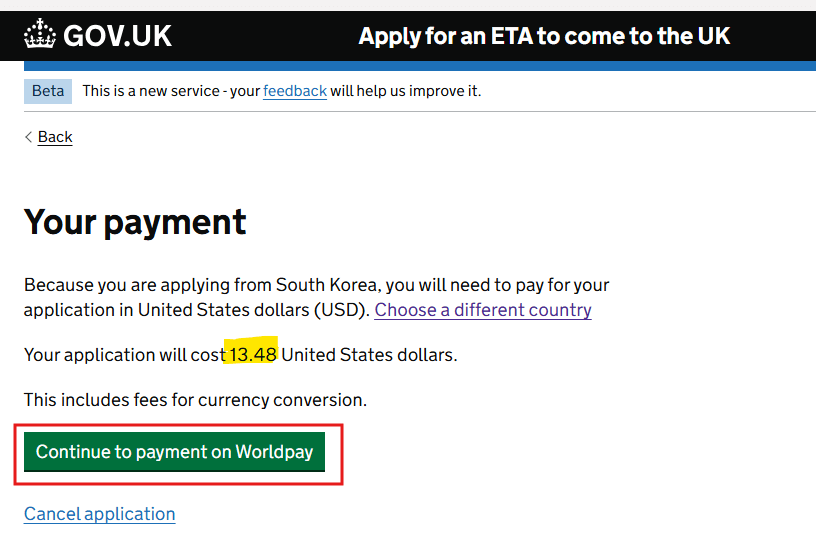 왼쪽과 같은 다음 화면의 어떤 통화로 결제할 거냐고 묻는 질문에 'South Korea' 입력 후 [Continue]를 누르고 다음 화면에서 다시 한번 [Continue to payment on Worldpay]를 누릅니다. 원화로는 결제를 할 수 없고 달러로 결제가 되며, 위에 언급했듯이 신청 비용은 13.48달러입니다.