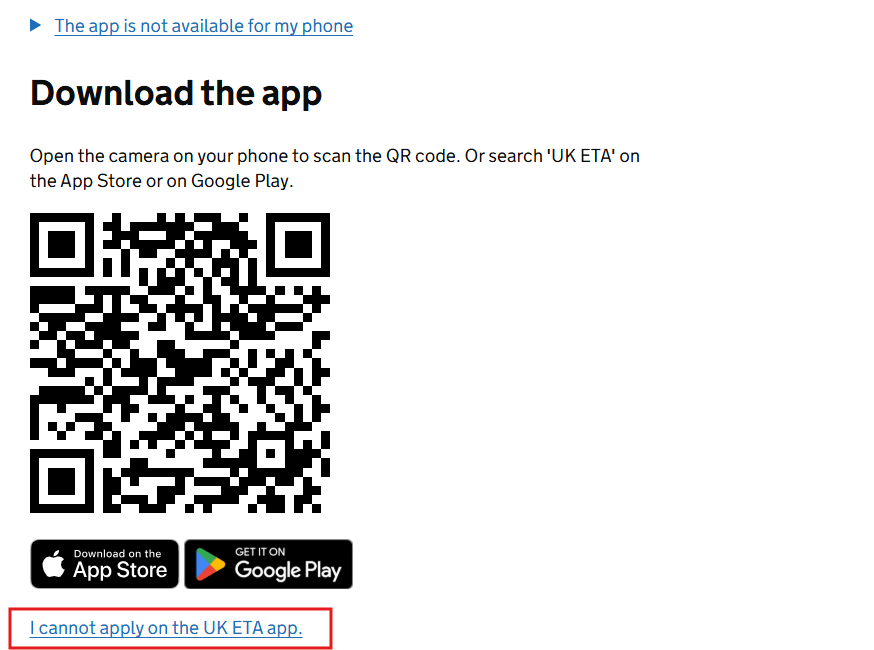 그럼 왼쪽 그림과 같이 어플을 설치하라는 권유메시지가 뜨는데, 서두에서 말씀드렸다시피 우리는 지금 홈페이지 신청방법에 대해 알아보는 중이므로 [I cannot apply on the UK ETA app.]을 클릭합니다. 다시 오른쪽 그림과 같은 어플 설치 유도 메시지가 뜨지만 가장 아래에 [Continue application online]을 누릅니다.
