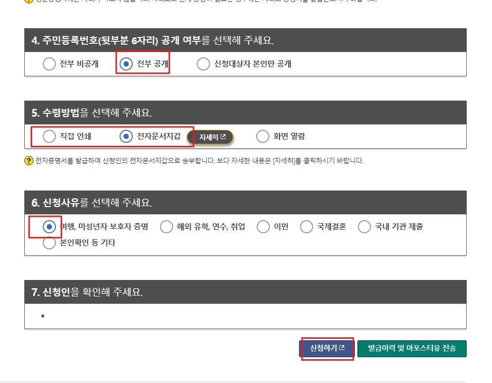 증명서 종류는 기본으로 앞에서 선택했으므로 건드릴 필요가 없고, 영문이름 활용에 동의하냐는 질문에 체크박스에 체크합니다. 주민번호는 [전부 공개], 수령방법과 신청사유를 본인에게 맞게 선택하고 [신청하기]를 누르면 끝입니다.