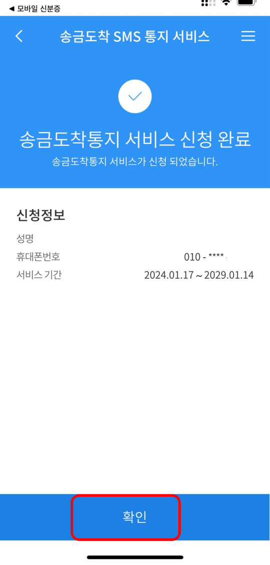 다음 화면에서 휴대폰 인증을 한 후 [다음], 다음 화면에서 [다음]을 누르면 '신청완료' 메시지를 확인할 수 있습니다. 서비스 기간에서 확인할 수 있듯이 이 효력은 5년간 유지됩니다. 참고로 입금내역에 혹시 수수료 1만원이 표시된다면 입금 다음날까지 취소가 가능하다고 하니, 알아두시면 좋을 것 같습니다.