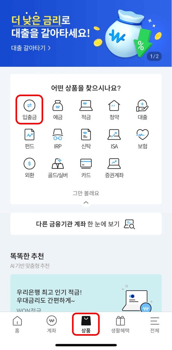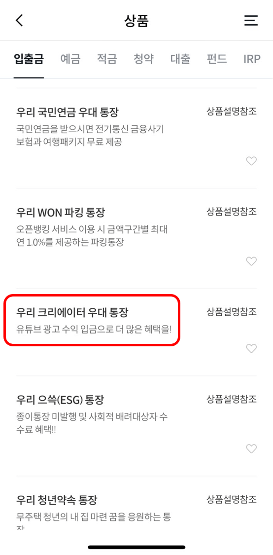 우리 크리에이터 우대 통장을 개설하는 방법은 크게 인터넷, 스마트폰, 영업점 방문을 통한 방법이 있는데 이 글에서는 스마트폰으로 쉽게 개설하는 방법을 알려드리겠습니다. 다른 글에서는 '전환가입'만 가능하다고 적은 것도 봤는데요, 필자가 가입할 때는 새로운 통장 개설이 가능해서 이 방법을 이용했습니다.