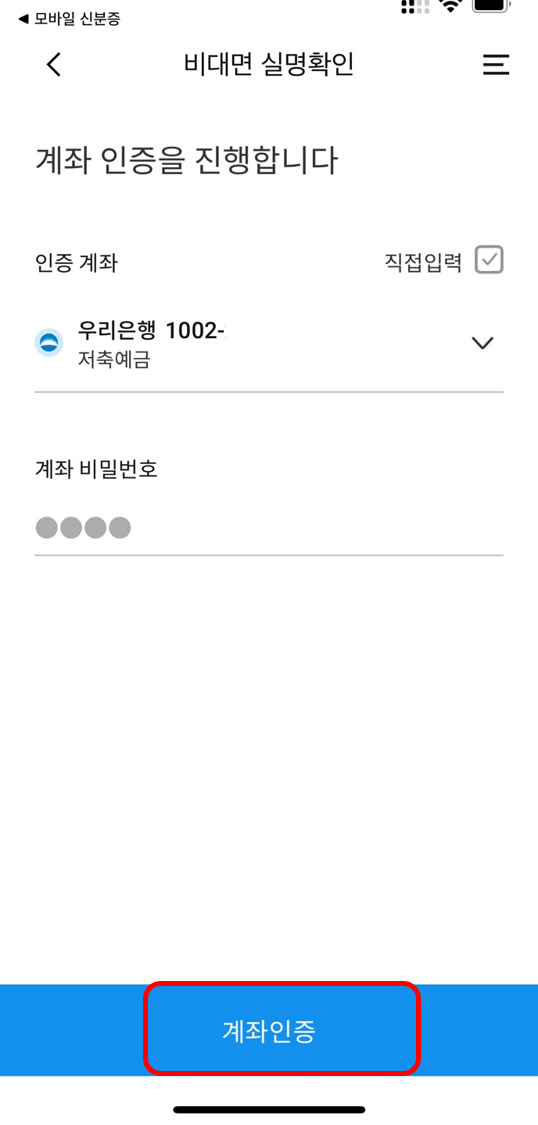 통신사를 통해 인증을 하면 신분증으로 확인을 하는데 신분증을 촬영하거나 모바일 운전면허증 어플이 있으면 저걸 누르면 자동으로 인식합니다. 비대면 실명확인에 대한 동의를 해주고 계좌를 인증합니다.