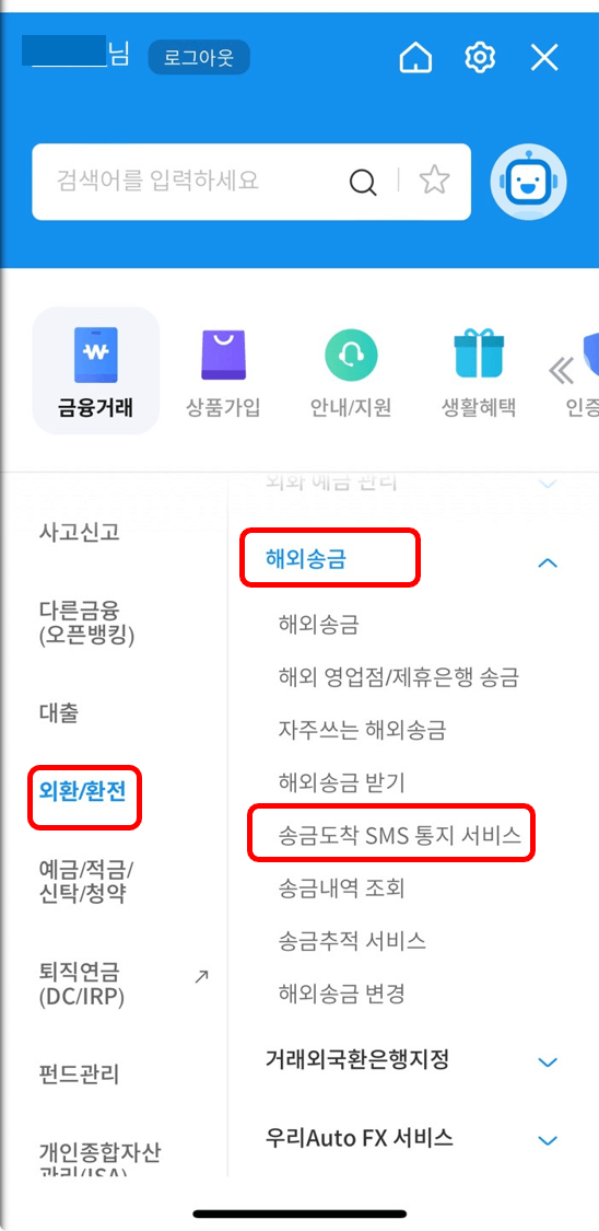 역시 우리은행 스마트폰 메인화면에서 가장 오른 쪽 [줄 세개] , 다음 화면에서 왼쪽 메뉴 [외환/환전] - [해외송금] - [송금도착SMS 통지 서비스]를 선택합니다. 다음 화면에서 [서비스 신청]을 누릅니다.