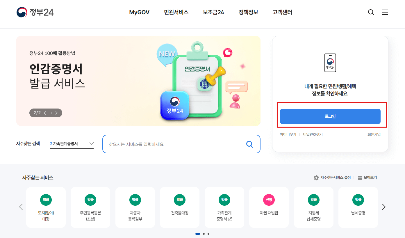 인감증명서 인터넷발급을 위해서는 먼저 정부 24 홈페이지에 접속해야합니다.