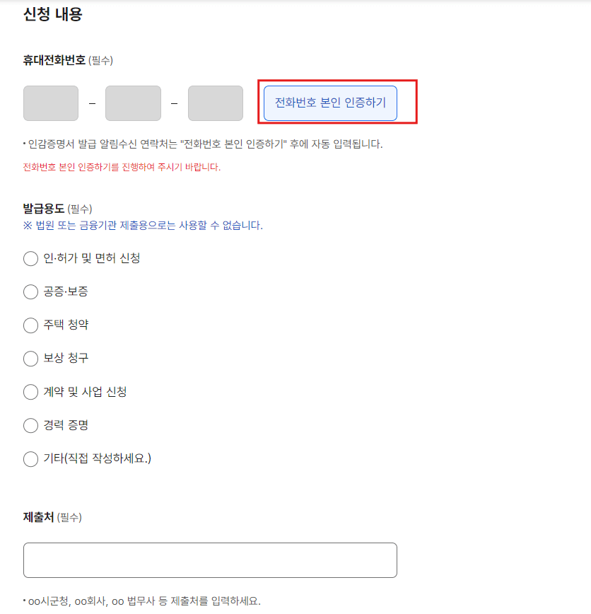 • 부동산 또는 자동차 매매용으로는 발급받을 수 없습니다.