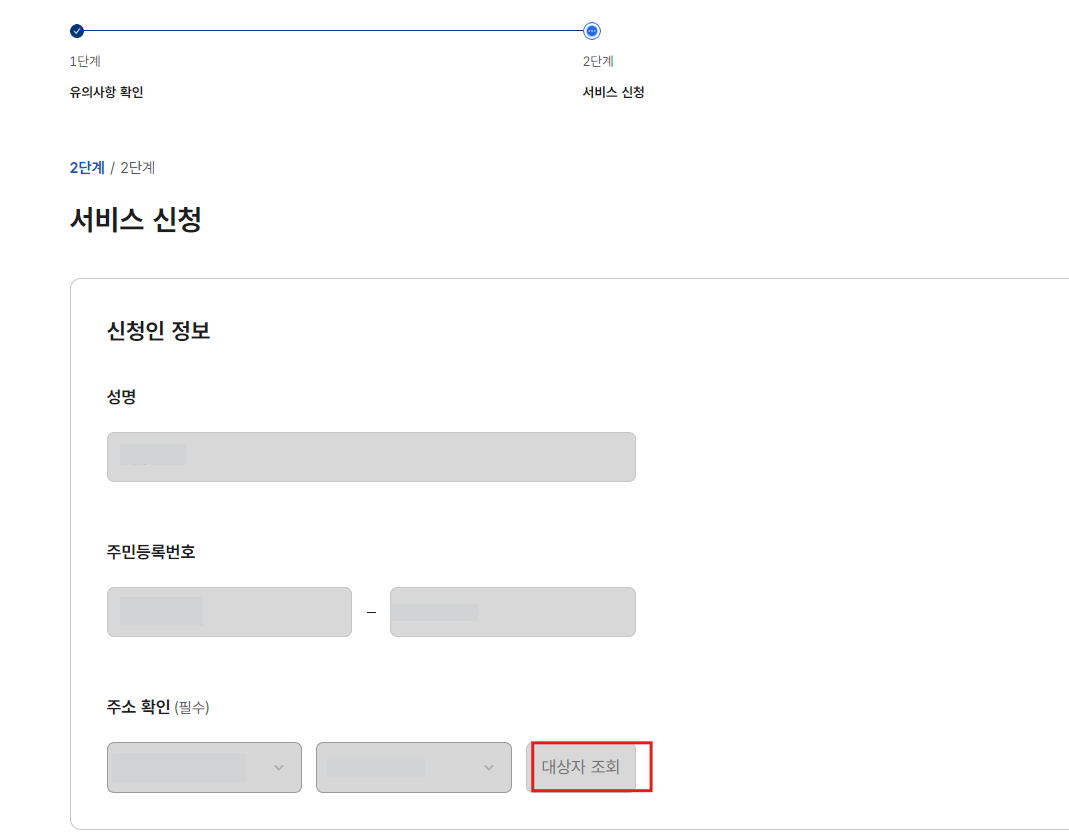 왼쪽과 같이 위에서 언급했던 유의사항이 나오는데요, 아래 [체크박스]에 체크 후 [다음으로]를 누릅니다. 그럼 오른쪽 그림처럼 아까 인증을 이미 진행했기 때문에 성명, 주민등록번호가 자동으로 표기되어 나옵니다. [대상자 조회]를 눌러 주소를 확인합니다.