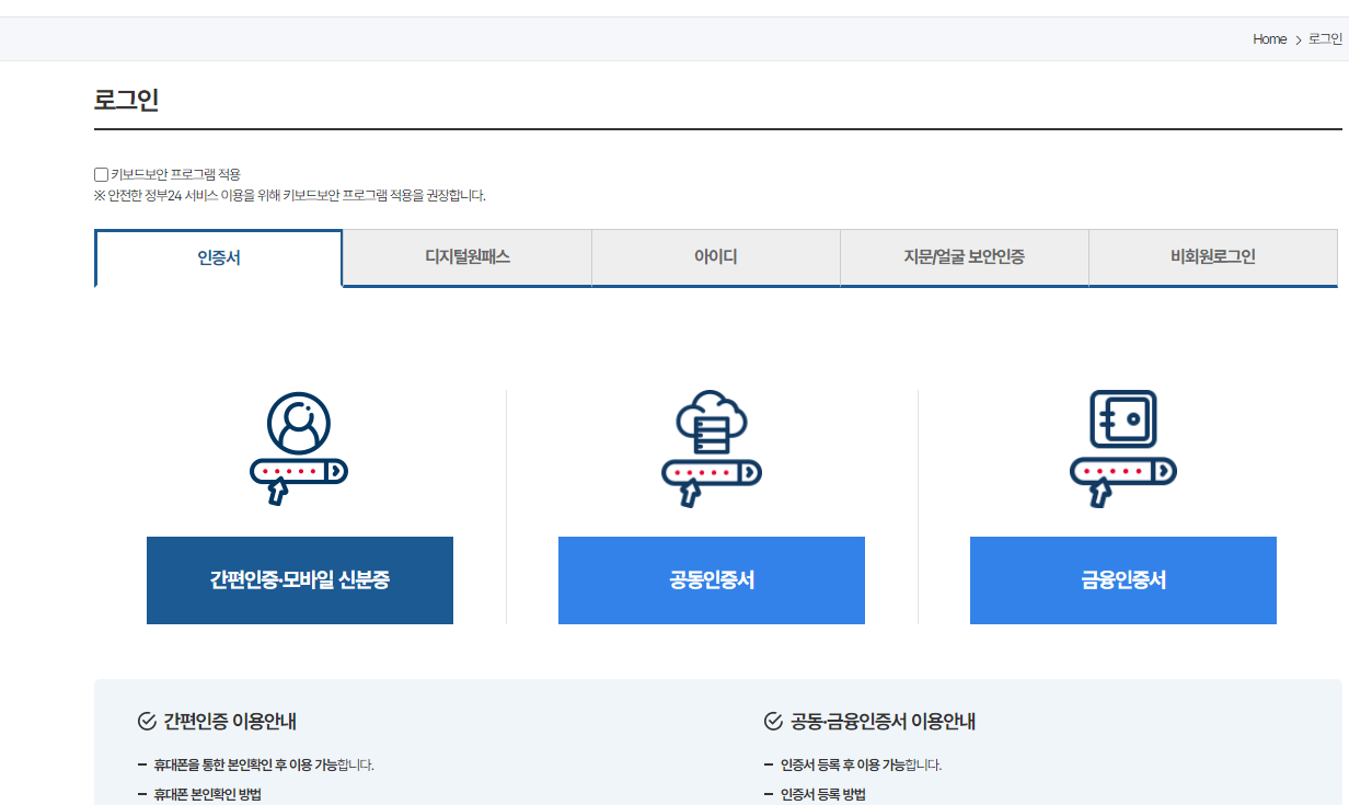 왼쪽과 같은 정부 24 홈페이지의 오른쪽 [로그인]을 누른 후, 오른쪽 그림과 같은 로그인 페이지에서 원하는 인증방법으로 로그인을 진행합니다. 인감증명서를 발급받기 위해서는 어차피 공동인증서와 같은 인증을 거쳐야 하기 때문에 [비회원록인]이 아닌 다른 방법을 선택하시길 권유드립니다.