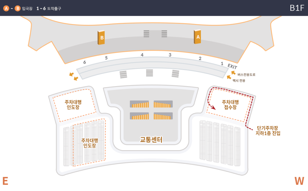 제1여객터미널 주차대행을 이용하기 위해서는 제1여객터미널 단기주차장(지하 1층)으로 진입 후, 단기주차장 3차로를 이용하여 지하 1층 A구역으로 이동하시면 됩니다.