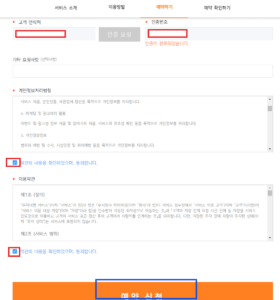 왼쪽은 제1여객터미널 주차대행 예약페이지인데요, 여기에 차량종류이용 항공사 등을 기입합니다. 다음 오른쪽과 같은 화면에서 연락처 인증 후, 약관에 동의 후 [예약 신청]을 누릅니다.