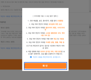 다음, 왼쪽과 같은 보상이 불가능한 항목이 표시되는데요, 잘 읽어보신 후 [확인]을 누르면 예약내역이 나타납니다.