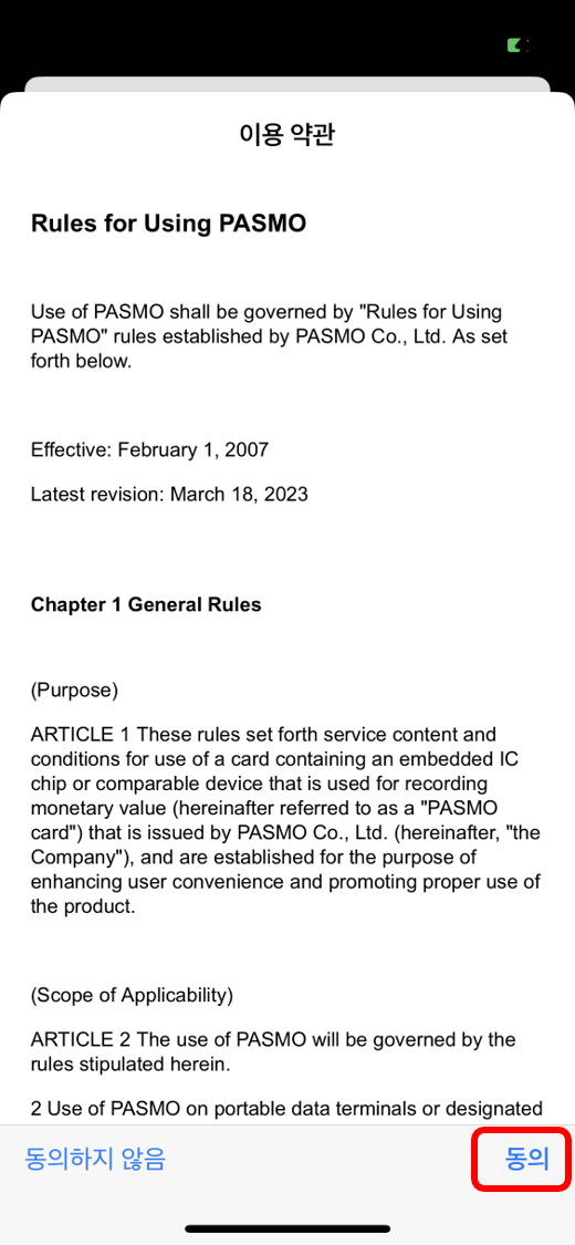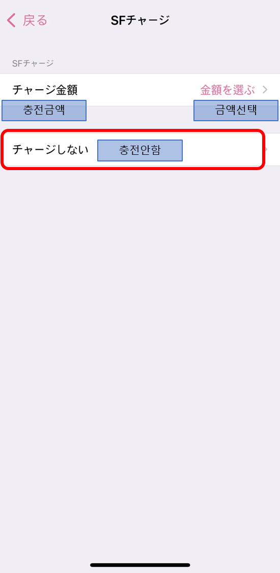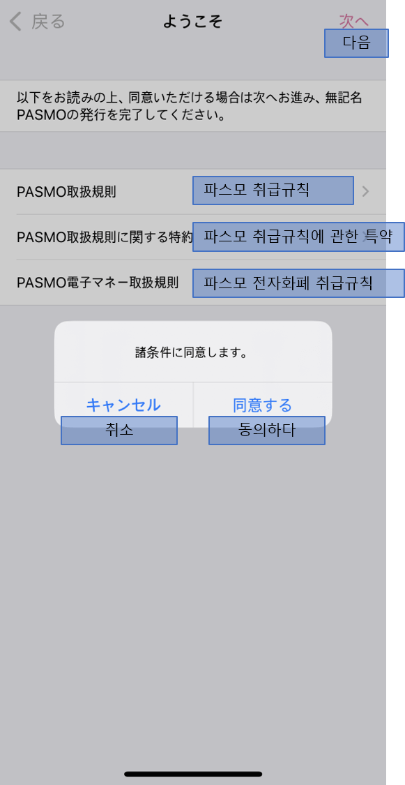 파스모 취업규칙에 동의하는 다음 화면에서 '동의하다'를 누른 후, 그 다음화면에서 '충전안함'을 누릅니다.
